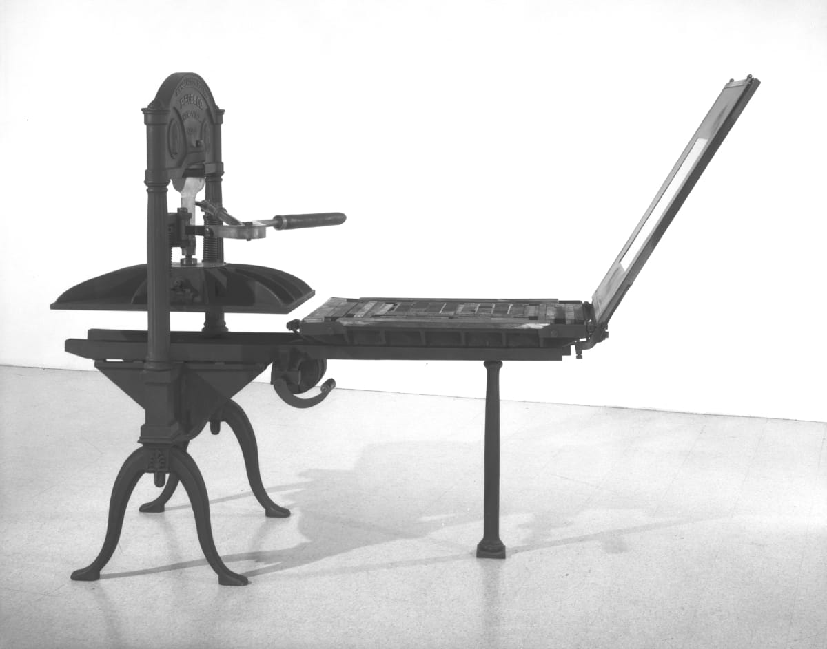 This peripatetic press was used to print newspapers in the 19th-century American West. Washington hand presses were rugged and extremely popular; this one crossed the Isthmus of Panama on its way from New Orleans to California's gold fields. In 1851, the press's owner, John Judson Ames, started San Diego's first newspaper. The press also printed newspapers in San Bernardino and Independence, California, and in Aurora, Nevada.