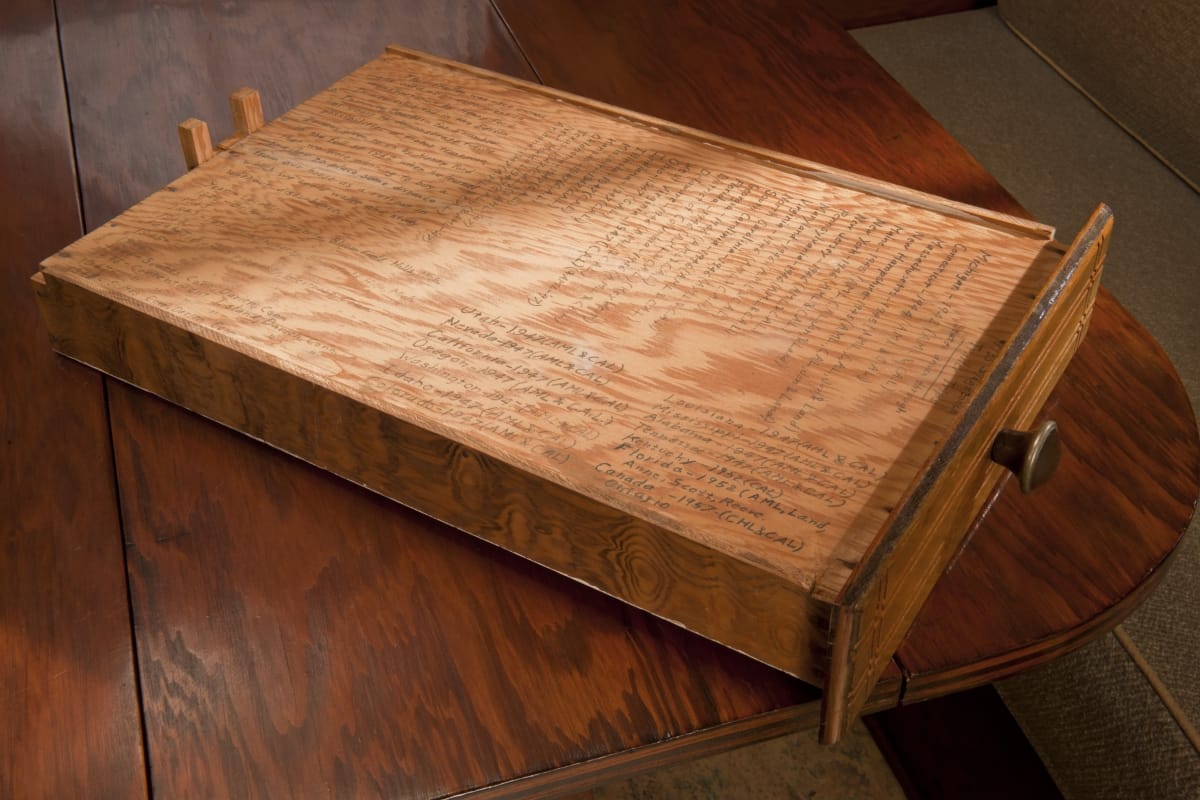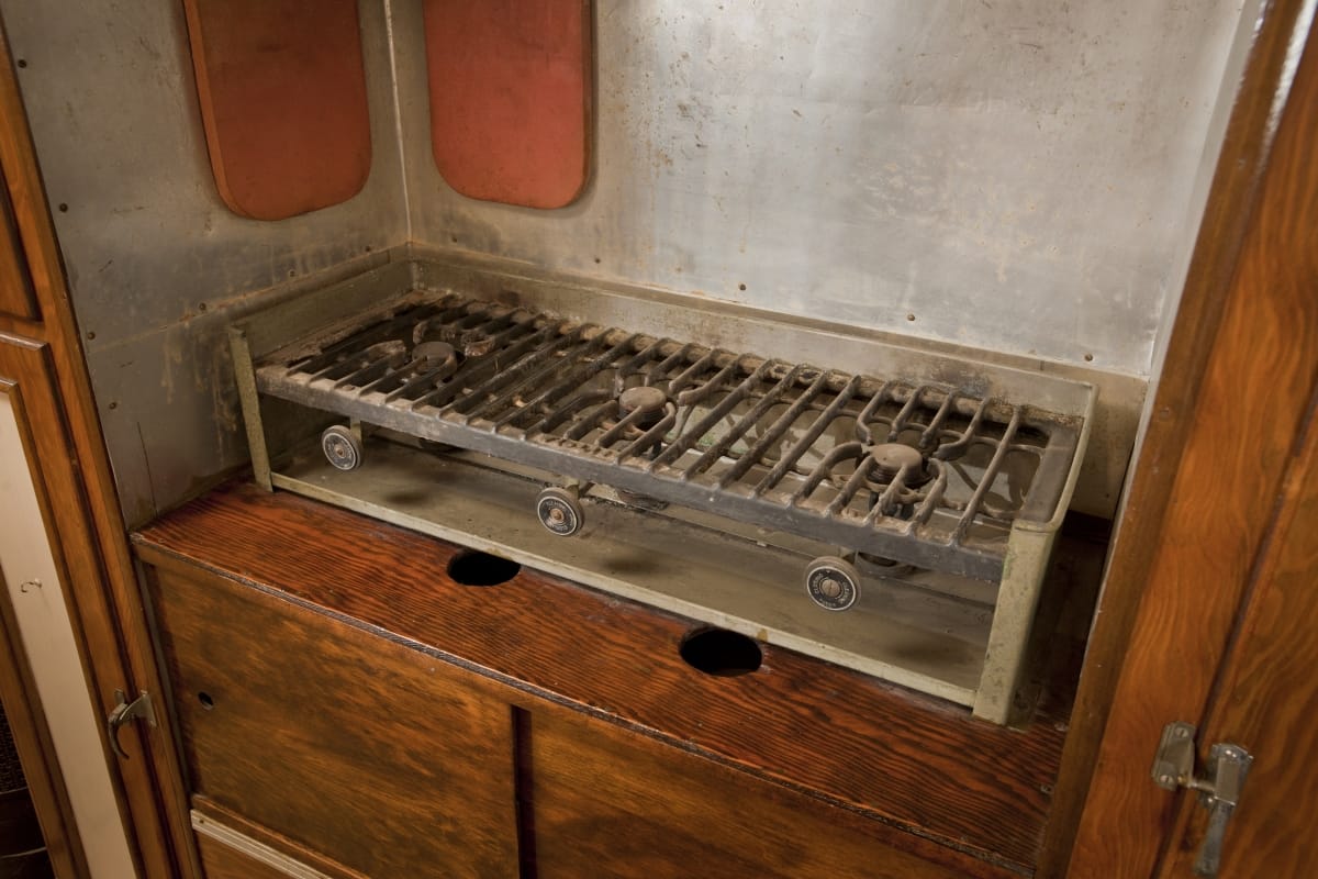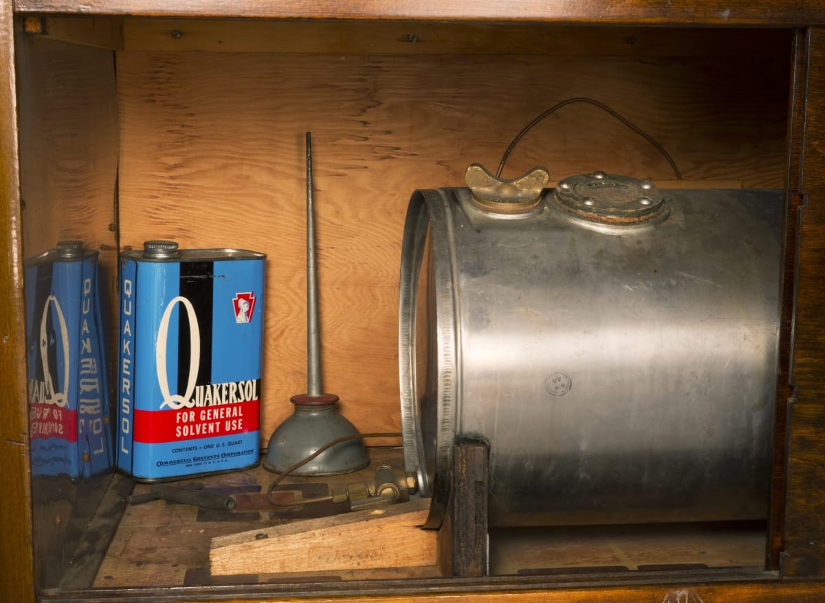 The following is handwritten on the bottom of a kitchen drawer in the trailer, by (most likely) Charles A. Lindbergh: TRAILER TRIPS- STATES DRIVEN THROUGH MICHIGAN - 1942 (A.M.L. & C.A.L) CONNECTICUT - 1944 (A.M.L & CAL) MASSACHUSETTS - 1945 (A.M.L., C.A.L., JON & LAND) NEW HAMPSHIRE - 1945 (A.M.L., C.A.L., JON & LAND) MAINE - 1945 (A.M.L., C.A.L., JON & LAND) NEW YORK - 1946 (A.M.L. & C.A.L.) NEW JERSEY - 1946 (A.M.L. & C.A.L.) PENNSYLVANIA - 1946 (A.M.L. & C.A.L.) MARYLAND - 1946 (A.M.L. & C.A.L.) VIRGINIA - 1946 (A.M.L. & C.A.L.) NORTH CAROLINA - 1946 (A.M.L. & C.A.L.) SOUTH CAROLINA - 1946 (A.M.L. & C.A.L.) GEORGIA - 1946 (A.M.L. & C.A.L.) FLORIDA - 1946 (A.M.L. & C.A.L.) (KEY WEST) DISTRICT OF COLUMBIA - 1946 (A.M.L. & C.A.L.) DELAWARE - 1946 (A.M.L. & C.A.L.) WEST VIRGINIA - 1947 (C.A.L.) (& AML-'47) OHIO - 1947 (C.A.L.) INDIANA - 1947 (C.A.L.) MISSOURI - 1947 (C.A.L.) KANSAS - 1947 (C.A.L.) OKLAHOMA - 1947 (C.A.L.) TEXAS - 1947 (C.A.L.) (& AML-'47) NEW MEXICO - 1947 (C.A.L.) (& AML-'47) ARIZONA - 1947 (A.M.L. & C.A.L.) / UTAH - 1947 (AML & CAL) NEVADA - 1947 (AML & CAL) CALIFORNIA - 1947 (AML & CAL) OREGON - 1947 (AML & C.A.L.) WASHINGTON - 1947 (A.M.L. & CAL) IDAHO - 1947 (AML & CAL) COLORADO - 1947 (AML & CAL) / LOUISIANA - 1947 (AML & CAL) MISSISSIPPI - 1947 (AML & CAL) ALABAMA - 1947 (AML & CAL) TENNESSEE - 1947 (AML & CAL) KENTUCKY - 1952 (CAL) FLORIDA - 1952 (AML, LAND, ANNE, SCOTT, REEVE. CANADA - 1957 - (CHL & CAL) ONTARIO / THIS TRAILER WAS ONCE OWNED, AND USED AS AN EXPERIMENT IN TRANSPORTATION BY HENRY FORD. IT WAS EXHIBITED IN THE EDISON INSTITUTE, DEARBORN FOR A NUMBER OF YEARS TO DEMONSTRATE FUTURE POSSIBILITIES OF MOTOR TRANSPORT. IT WAS GIVEN TO US BY HENRY FORD IN THE FALL OF 1942 WHEN HE LEARNED THAT WE WERE PLANNING TO BUY A TRAILER TO PLACE SOME DISTANCE FROM OUR HOUSE AS A RETREAT IN WHICH WE COULD WRITE AND STUDY WITHOUT DISTURBANCE. YEAR - LOCATION 1942 - BELKNAP PROPERTY, BLOOMFIELD HILLS, MICH. 1943 - " " " " " " " " 1943 - PATTERSON PROPERTY, BLOOMFIELD HILLS, MICH. 1944 - " " " " " " " " 1944 - TOMPKINS PROPERTY, WESTPORT, CONN. 1945 - " " " " " " " " 1946 - " " " " " " " " 1946 - SCOTTS COVE, DARIEN, CONN. 1946 - CONTENTMENT ISLAND, DARIEN, CONN. 1947 - " " " " " " 1947 - SCOTTS COVE, DARIEN, CONN. [AML = Anne Morrow Lindbergh; CAL = Charles Augustus Lindbergh; Jon Lindbergh (b.1932), Land Morrow Lindbergh (b.1937); Anne Lindbergh (b.1940), Scott Lindbergh (b.1942) and Reeve Lindbergh (b.1945).] Marked on trailer hitch: 150 SLIMP. K in diamond Decal on right door of upper sink cabinet and above bathroom closet: STAGE COACH TRAILER / A CUSTOM BUILT PRODUCT OF / IDEAL MANUFACTURING CORP. / MISHAWAKA, INDIANA (blue/bronze colored w/ engraved stagecoach and horses) Tag tacked to interior of right upper sink cabinet: LUBRICATION CAUTION / AFTER INSTALLATION OF SLIMPWHEEL COUPLER [...] SLIMP AXLE PRODUCTS Paper tacked on interior upper left cabinet above stove: (in pencil) NEW TRAILER STOVE / (1948) / (printed) OPERATING DIRECTIONS [...] Paper tacked on interior upper left cabinet above stove: (handwritten) COOKING STOVE & HEATER / BOTH RUN ON KERSOSENE. / PRIME COOKING STOVE WITH ALCOHOL. Paper on interior of upper center cabinet above stove: (printed) DIRECTIONS / WILLIS KEROSENE STOVES [...]