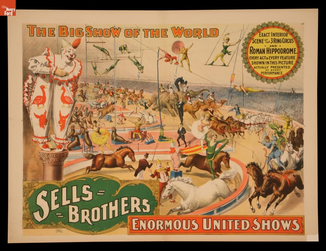 Circus poster printed on top: THE BIG SHOW OF THE WORLD Printed in decorated circle: EXACT INTERIOR / SCENE OF THE 3 RING CIRCUS / AND / ROMAN HIPPODROME / EVERY ACT & EVERY FEATURE/ SHOWN IN THIS PICTURE / ACTUALLY PRESENTED / AT EVERY / PERFORMANCE. Printed at bottom: SELLS / BROTHERS/ENORMOUS UNITED SHOWS. Inscribed at lower left: Copyright by / THE / STROBRDIGE / LITH. CO. / Cin'ti New York. Printed at upper right of image: S-12