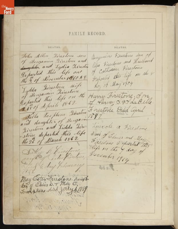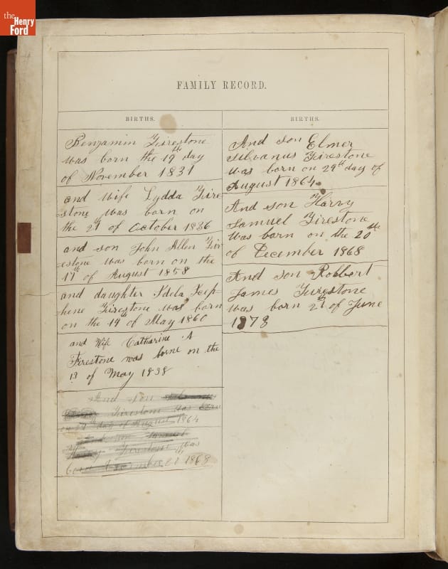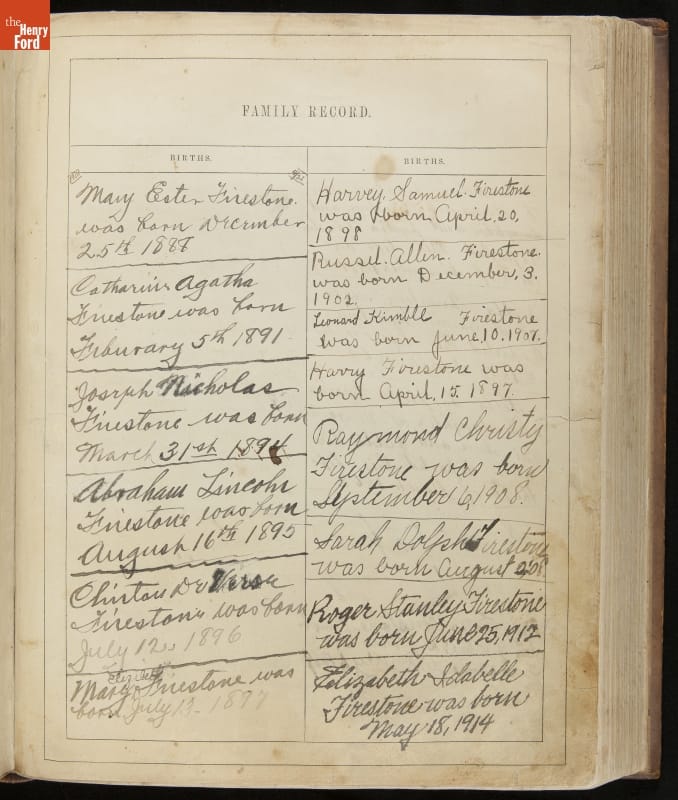 Many 19th-century Americans recorded births, deaths and marriages in family bibles. Mothers, or some other family member, faithfully documented these significant family events on dedicated pages in the bible. Subsequent generations sometimes added and updated entries. This bible belonged to the Firestone family and includes the name of Harvey S. Firestone, the founder of Firestone Tire and Rubber Company.