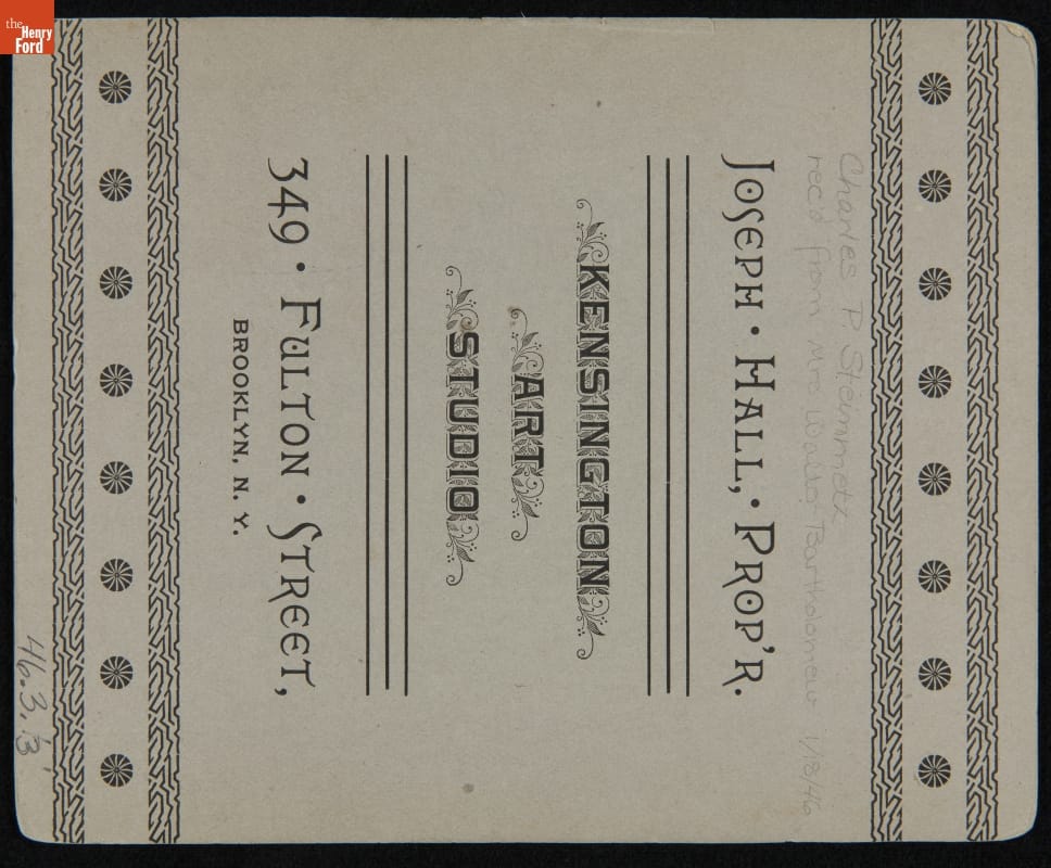on front, top: Souvenir of American Institute Fair, 1890. on front, bottom: Hall's Celebrated Flash-Light Portraits. on back: JOSEPH HALL, PROP'R. / KENSINGTON ART STUDIO / 349 FULTON STREET BROOKLYN, N.Y.