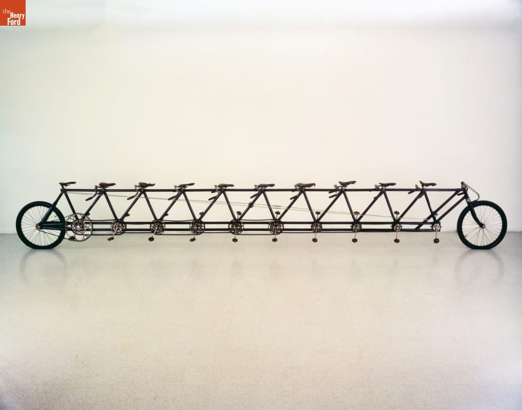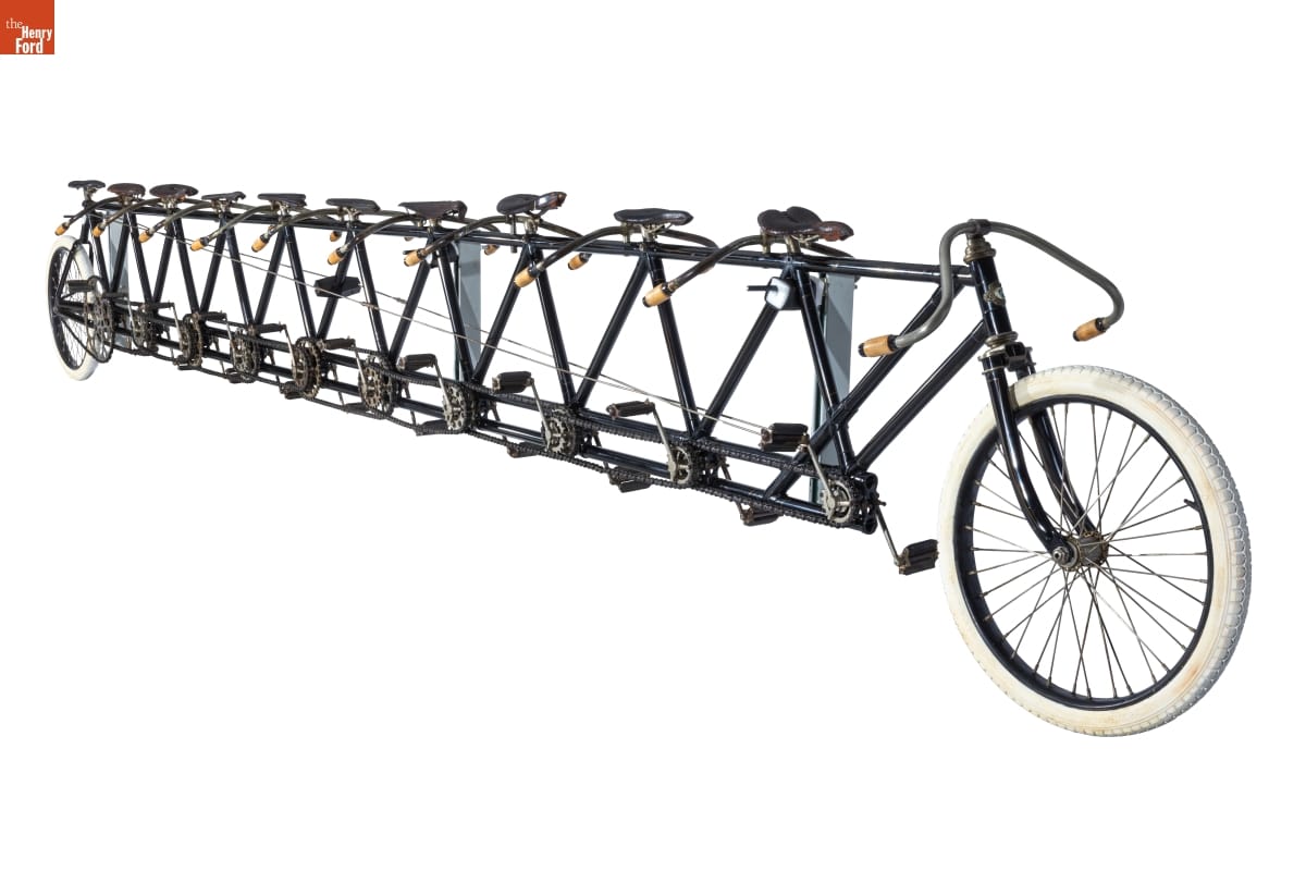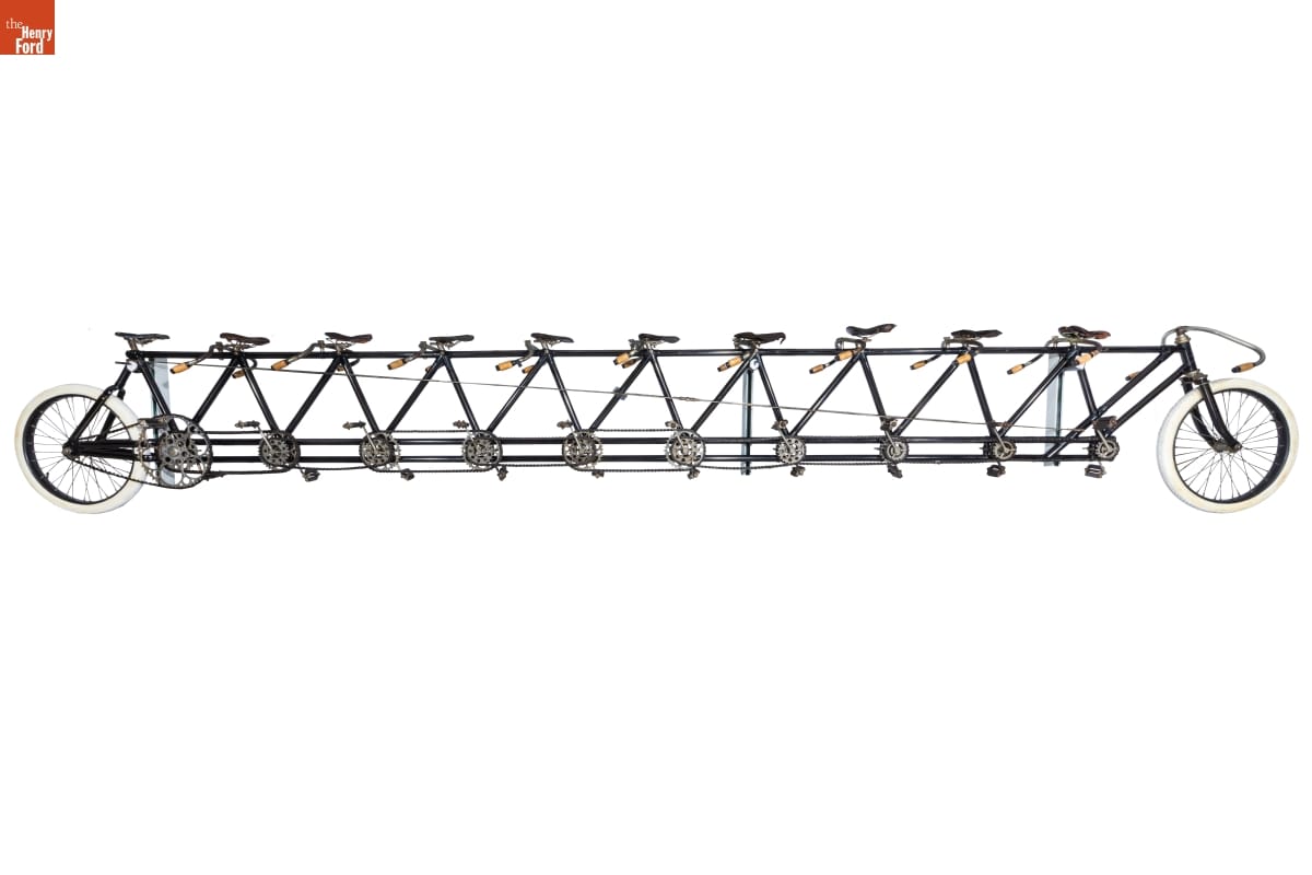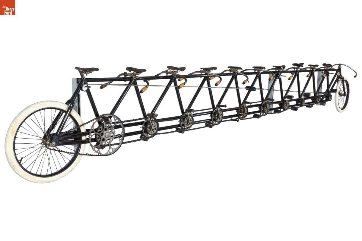 Charles Metz of Waltham, Massachusetts, built the Orient Oriten in 1896 as a way to promote his Orient line of bicycles. Metz featured this 23-foot-long, 305-pound ten-seater at bicycle meets and races throughout the country. Though difficult to ride, the vehicle could reach speeds of 45 miles per hour. The Henry Ford owns the only surviving Oriten.