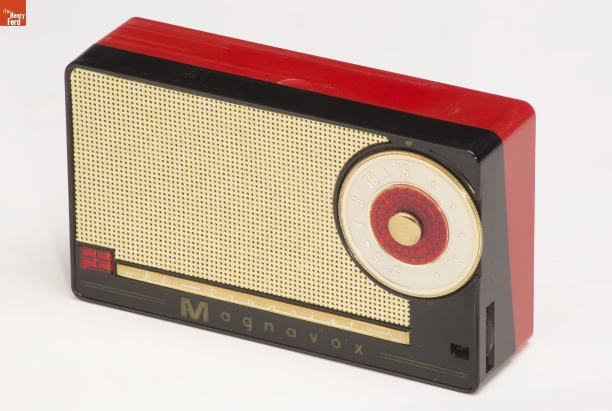 The size of radios shrank following the advent of transistor technology. Even the smallest vacuum tubes were bulky, and their power consumption ensured the need for large batteries. Transistor radios made of lightweight plastics were cheap and truly portable. With the addition of an earphone a radio such as this allowed the listener to enjoy a completely personal listening experience.