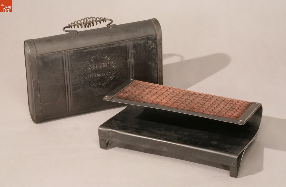 This X-Radium footwarmer made by the Novelty Manufacturing Company in Jackson, Michigan, depended on radiant heat from a special patented brick placed inside. Users had to remember to heat the brick before their trip.