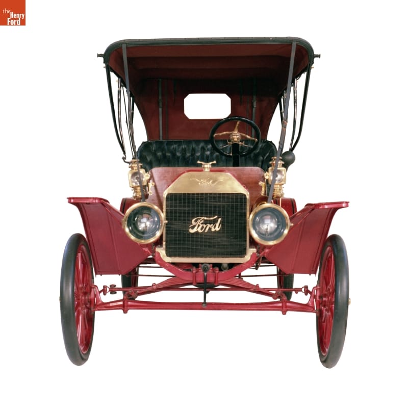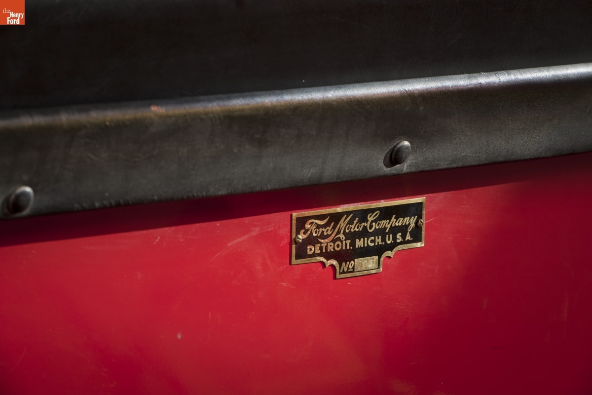 on plate, rear of car: FORD MOTOR CO. / DETROIT, MICH. on dash lamps: E&J / PAT / DEC. 9, 1908 / DETROIT, MICH. on headlamps: THE EDMUNDS & JONES MF'G CO / MODEL 466 / DETROIT on radiator & radiator shell: FORD on plate under front bench: FORD MOTOR COMPANY / DETROIT MICH, USA