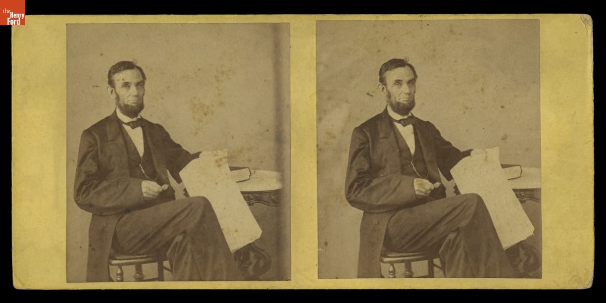 This stereograph shows President Abraham Lincoln seated in a chair beside a small table, holding a paper in one hand and folded spectacles in his other hand. Alexander Gardner originally made this photograph in Washington, D.C. on Sunday August 9, 1863. Gardner had just opened his new studio and President Lincoln agreed to be the first customer. The maker of this stereograph is unknown, but there is a two-cent tax stamp glued to the back, indicating it was made between 1864 and 1866.