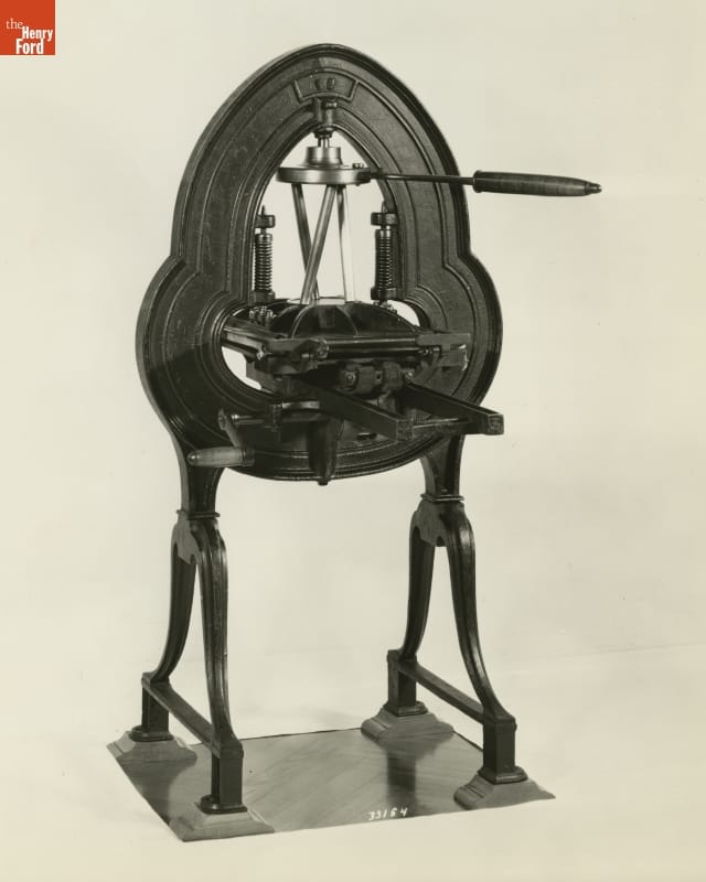 Patented by Abraham O. Stansbury in 1821, this press included an innovative "torsion toggle." When the press bar was turned, three inclined rods straightened, exerting pressure on the platen to make a print impression. The spring-loaded platen returned to its starting position once the print was made.