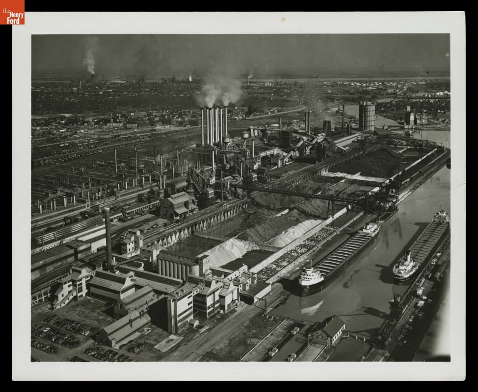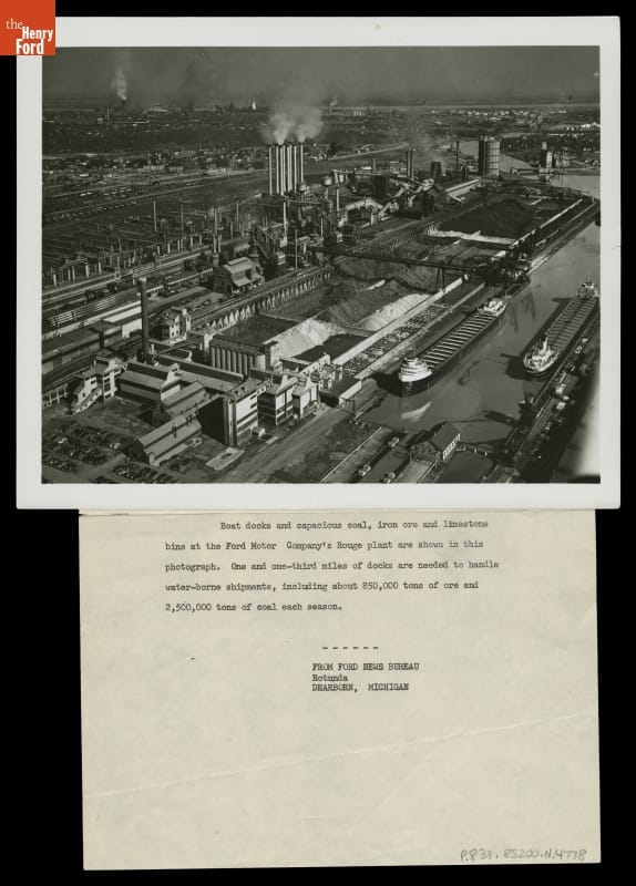 Ford Motor Company built the Rouge Plant with the ability to create automobiles from raw materials. In this photograph, the boat docks and huge coal, iron ore and limestone bins are visible. In 1948, about 850,000 tons of ore and 2,500,000 tons of coal arrived by boat and filled these bins to be used towards building Ford cars.
