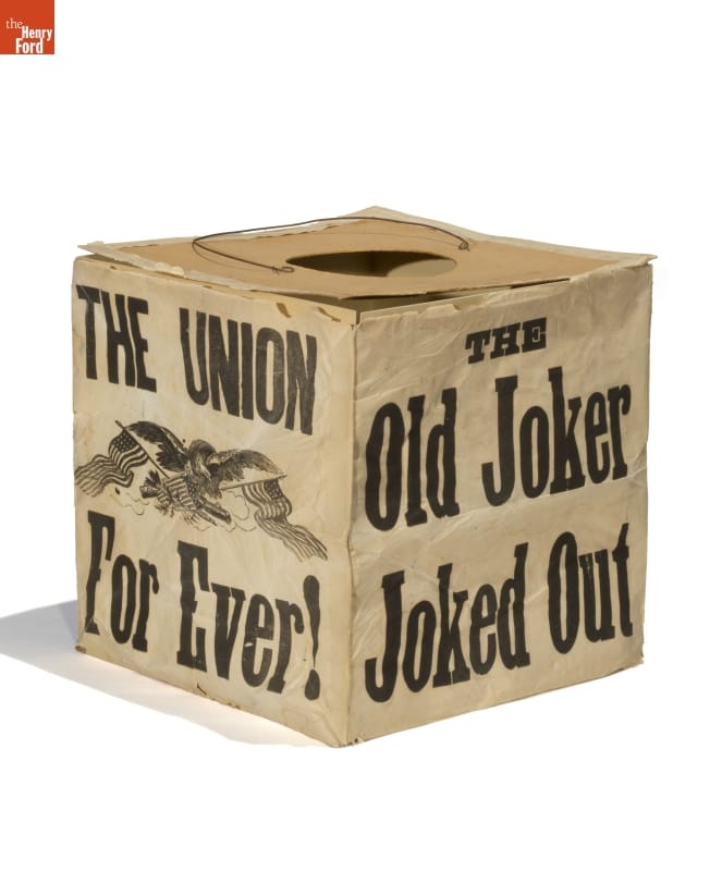 Late-nineteenth-century political parties rallied their supporters by holding torchlight parades. In the evening, marchers lit up the street carrying torches, lamps and lanterns. Inexpensive paper lanterns glowed with the image or name of the party's candidate or other patriotic imagery. In 1864, backers of General George McClellan used lanterns like this to call for the defeat of the "Old Joker," President Abraham Lincoln.