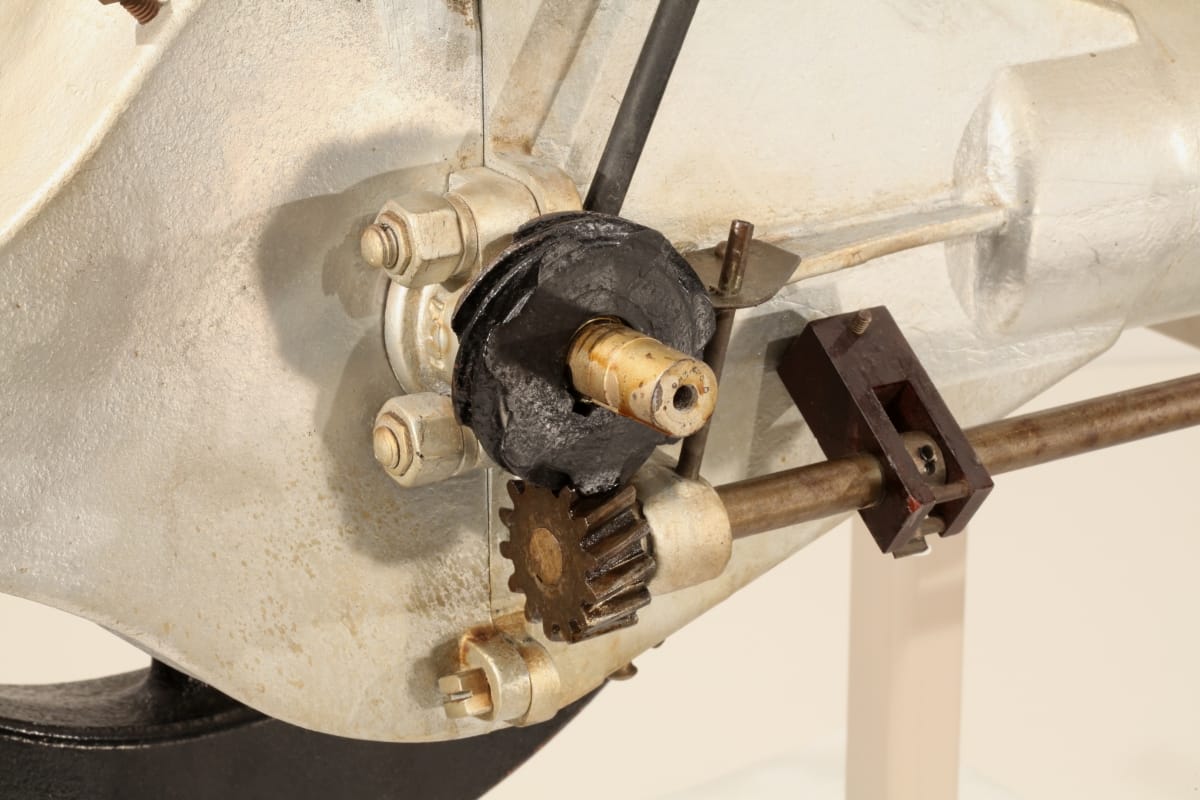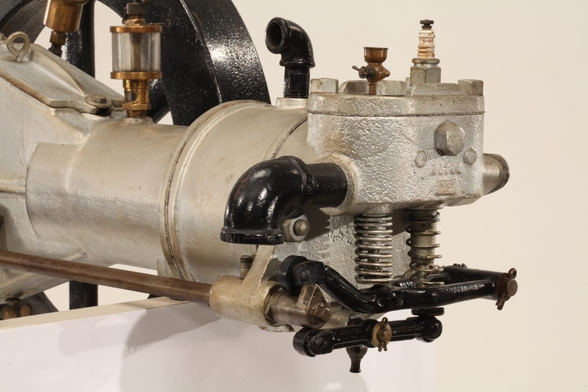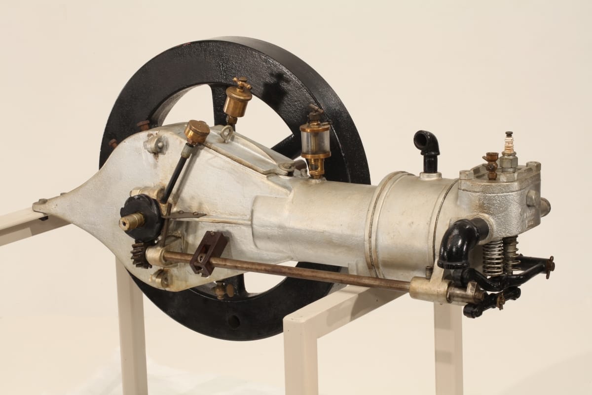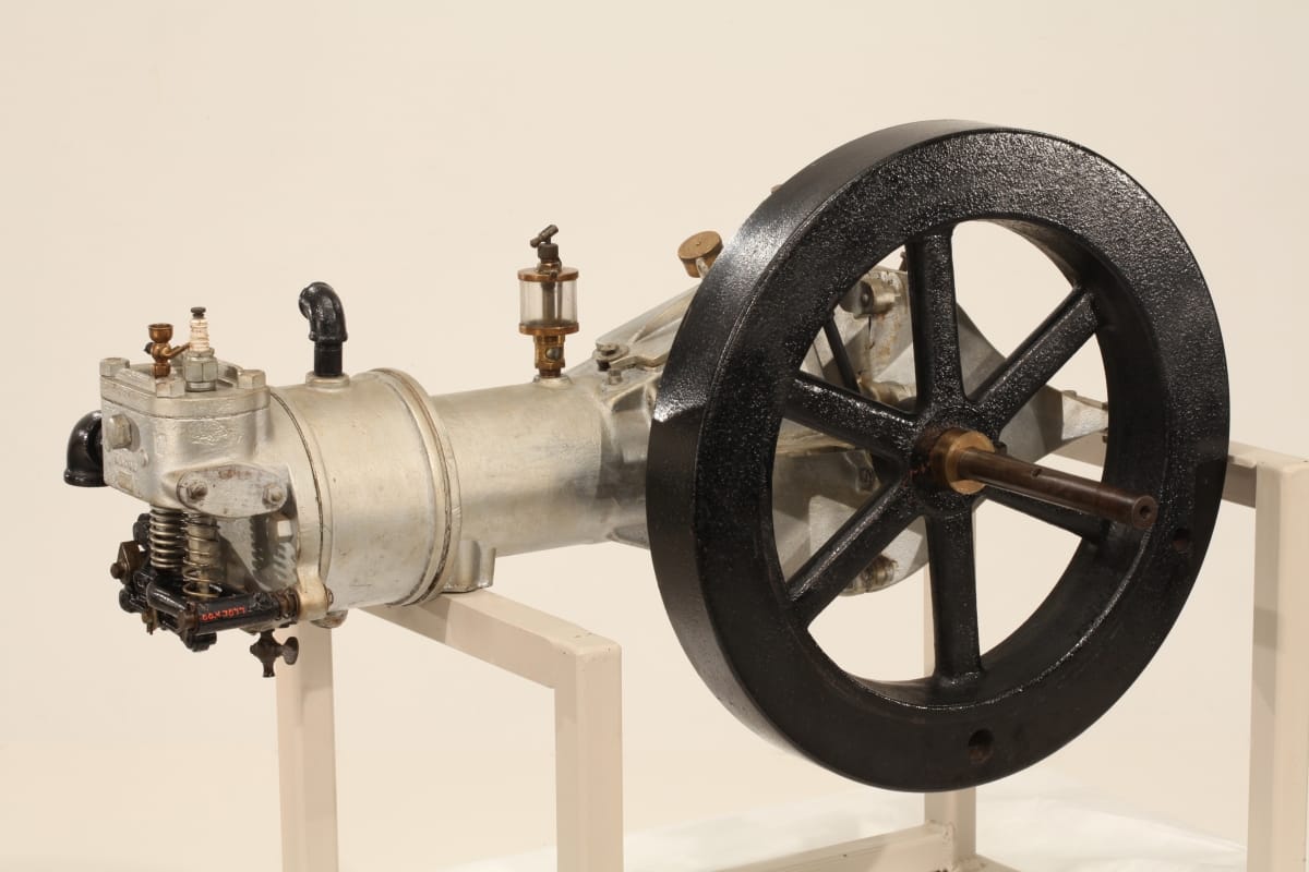 This single-cylinder, four-horsepower engine powered the Oldsmobile Curved Dash runabout. It has one cylinder, one piston, one connecting rod and crank, one balance wheel, and two valves. The complications of larger multi-cylinder engines were eliminated. The engine's simplicity and the vehicle's affordable $650 price made the Curved Dash runabout America's first car produced in large numbers.