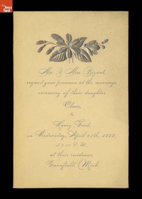 Invitation to the Wedding of Clara Bryant and Henry Ford, Greenfield, Michigan, April 11, 1888