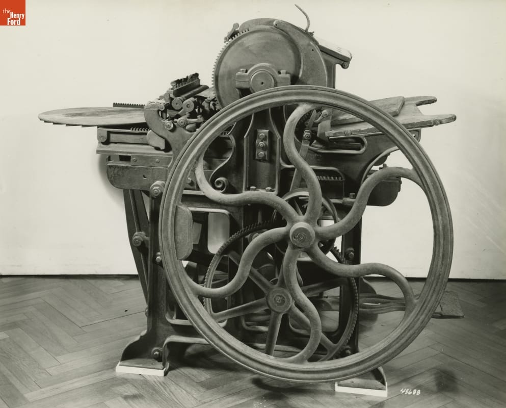 Large cylinder presses were typically used to print newspapers. A curved printing plate attached to the drum rolled over the flat paper surface, leaving an impression behind. Designed for higher capacity than smaller platen hand presses, cylinder and rotary presses produced thousands of copies per hour. This particular press was used to print the Constantine Advertiser Record in Michigan.