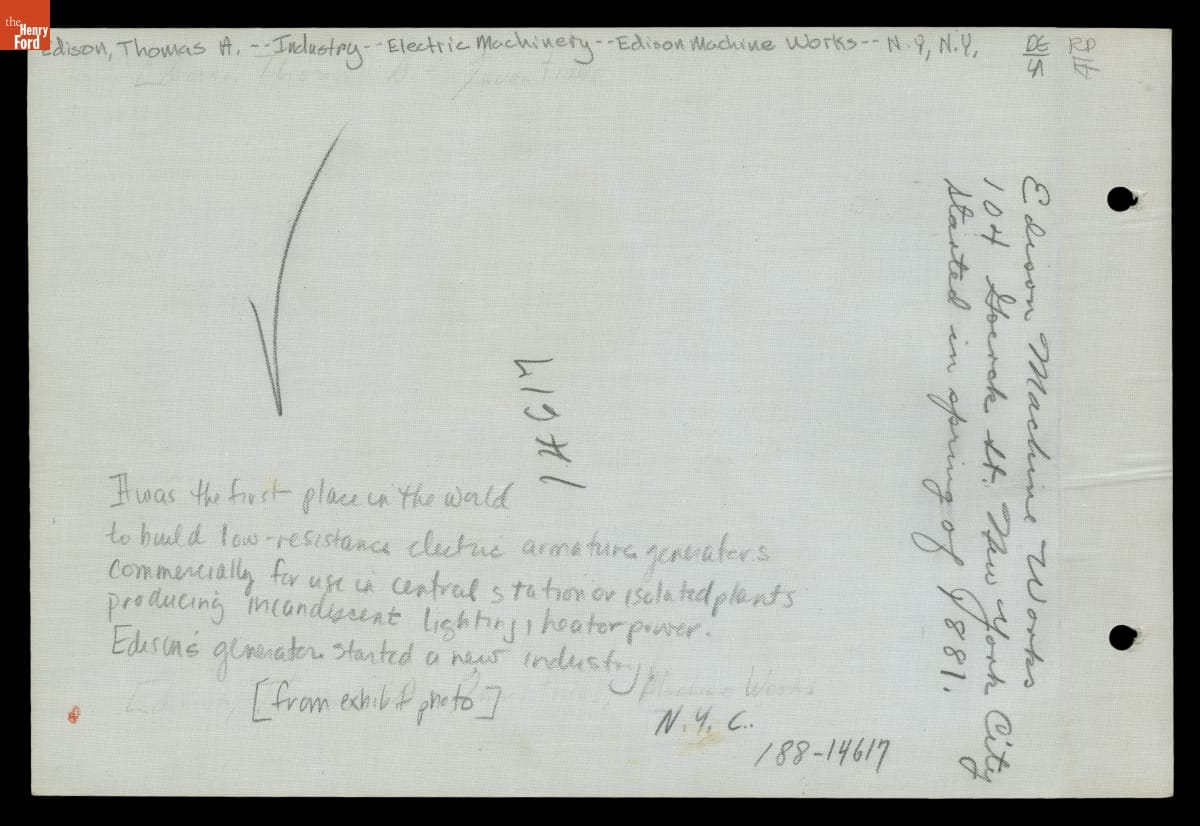 In 1881, Thomas Edison formed the Edison Machine Works to produce dynamos that would generate the electricity used to light homes and businesses outfitted with his newly invented incandescent lamps. In addition to making direct current generators, Edison Machine Works employees designed, and tested new equipment. Nikola Tesla worked there for six months in 1884 before leaving to develop an alternating current arc lighting system.
