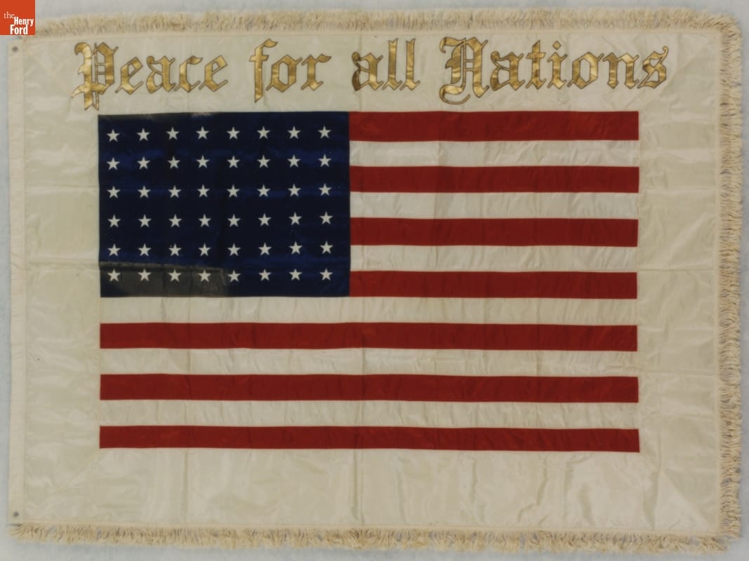 This flag is associated with Henry Ford's "Peace Ship" expedition of 1915. Ford paid to sail more than 100 delegates and reporters to Europe in December 1915. His goal was to establish a conference of neutral nations that could end World War I. While the mission failed to bring peace, it brought extensive publicity to Ford and the pacifist cause.
