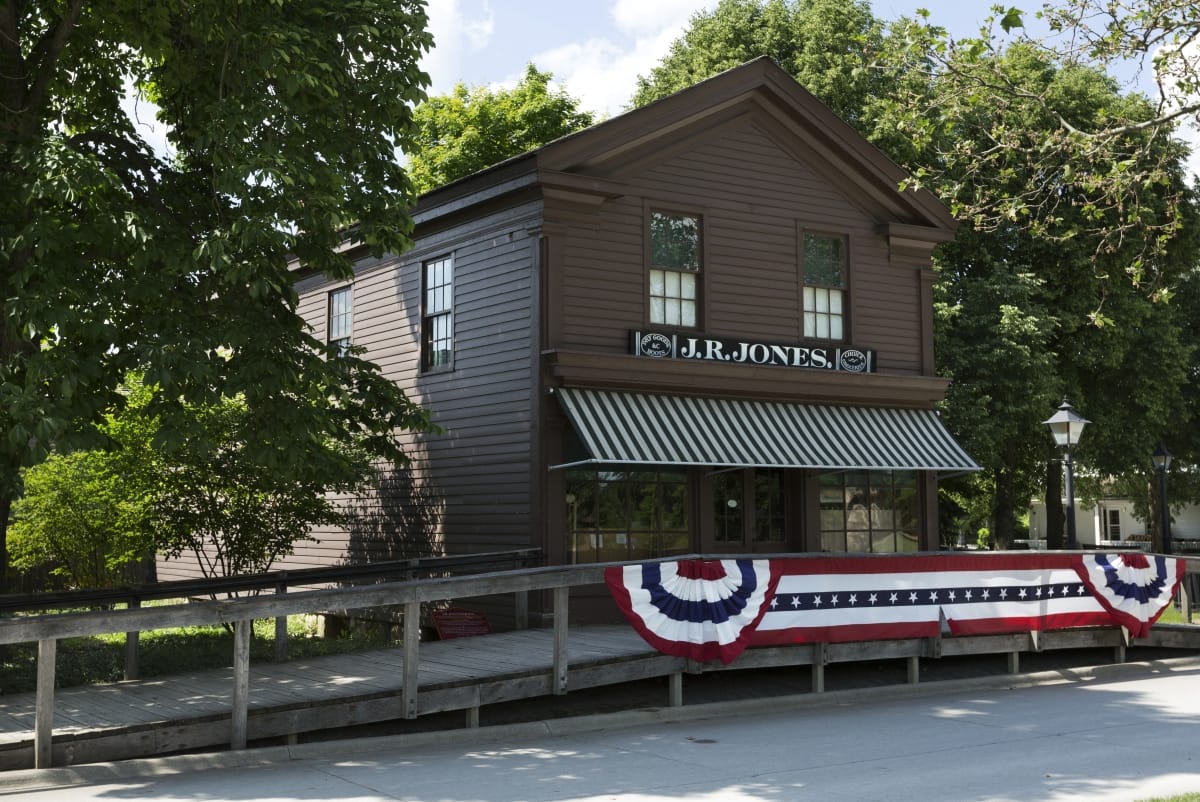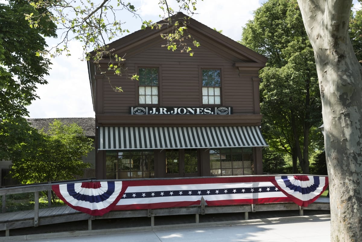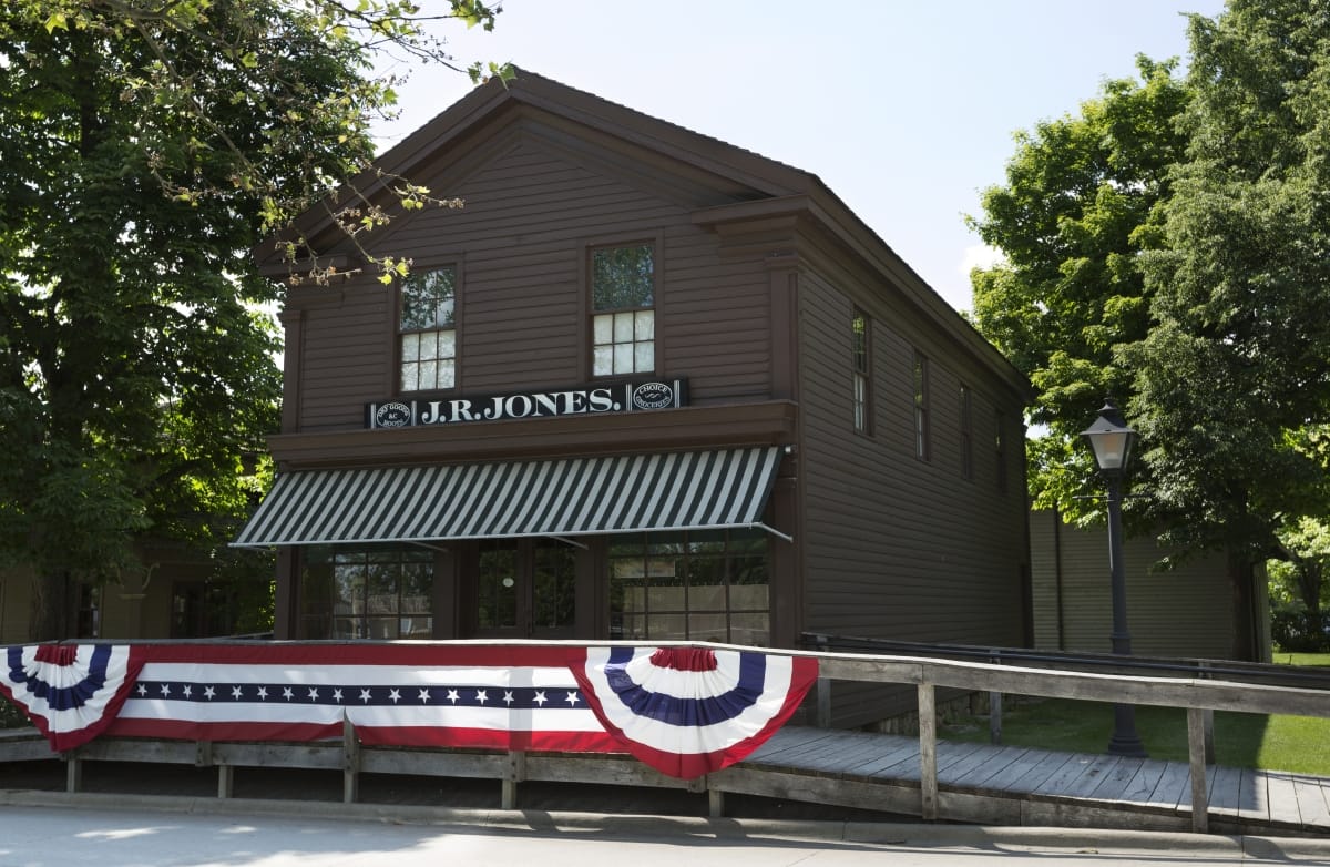 James R. Jones was one of nine different proprietors who operated a general merchandise store in this building between 1857 and 1927. From 1882 to 1888, Jones sold products like coffee, sugar, fabric, and shoes. He also boasted the first telephone in town. General stores were organized shopping spaces. Long shelves with groupings of similar products lined each side.