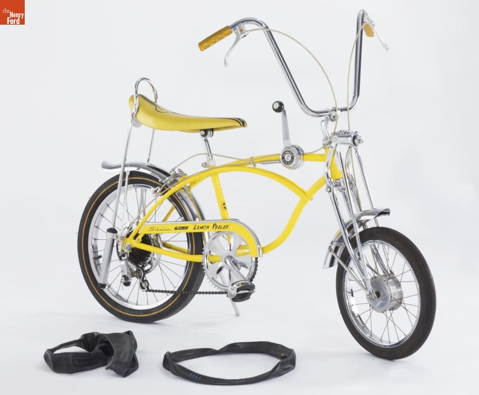After seeing kids in southern California customize their bicycles with "longhorn" handlebars and "banana" seats, Schwinn introduced its Sting-Ray line in 1963. The sporty bikes were a smash, selling two million copies by 1968. Drag racing funny cars inspired this Lemon Peeler Sting-Ray with its small front tire, front drum brake, springer suspension fork, and five-speed stick shift.