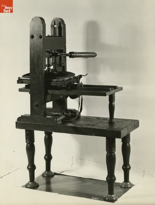 Adam Ramage of Philadelphia was the first well-known press maker in America, in business from 1800-1850. He improved upon older wooden presses, using iron for the bed and platen, and a larger screw mechanism. Its low cost and small size made the Ramage popular as a proofing and job press. This "foolscap" press was made by Ramage's successor, Frederick Bronstrup.