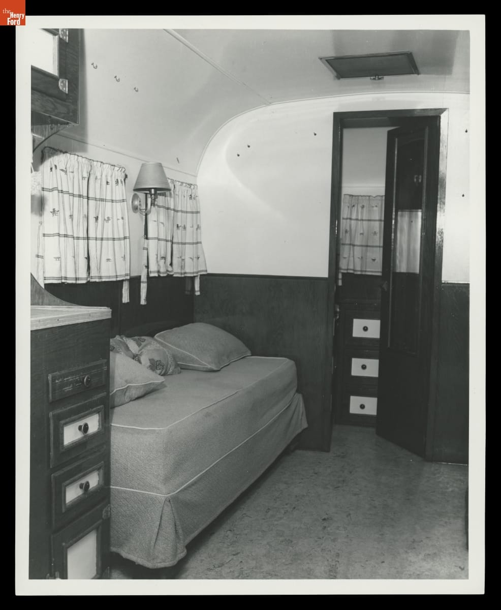 This photograph shows the interior of the trailer Henry Ford gave to his friend Charles Lindbergh in 1942. Charles and his wife Anne used it as a home on the road and as a spare room and study at home. Anne wrote The Steep Ascent here, and Charles wrote portions of his Pulitzer Prize-winning book The Spirit of St. Louis.