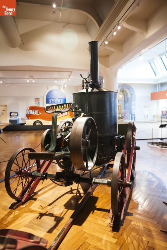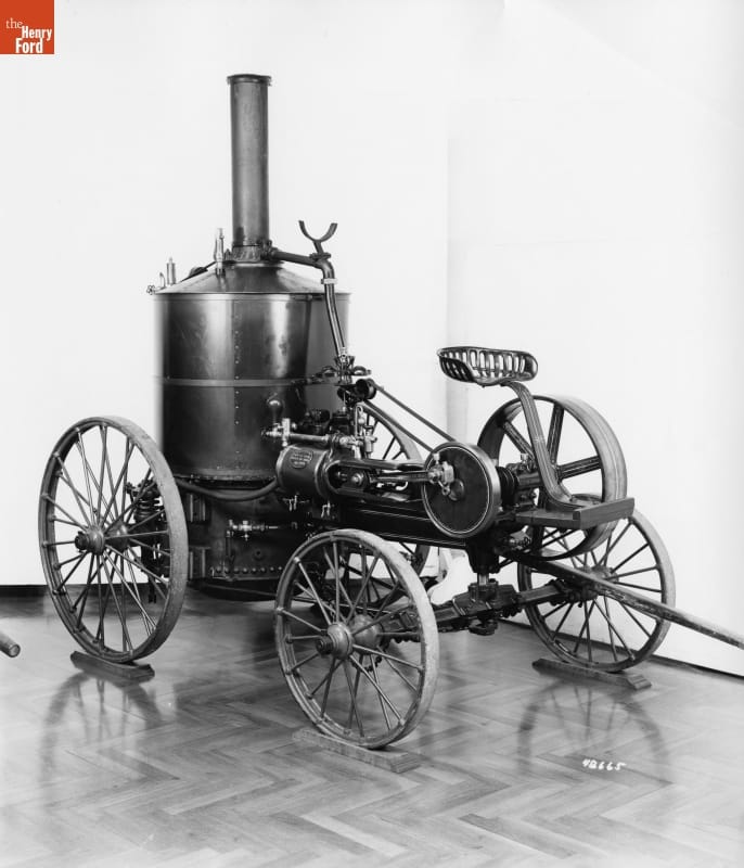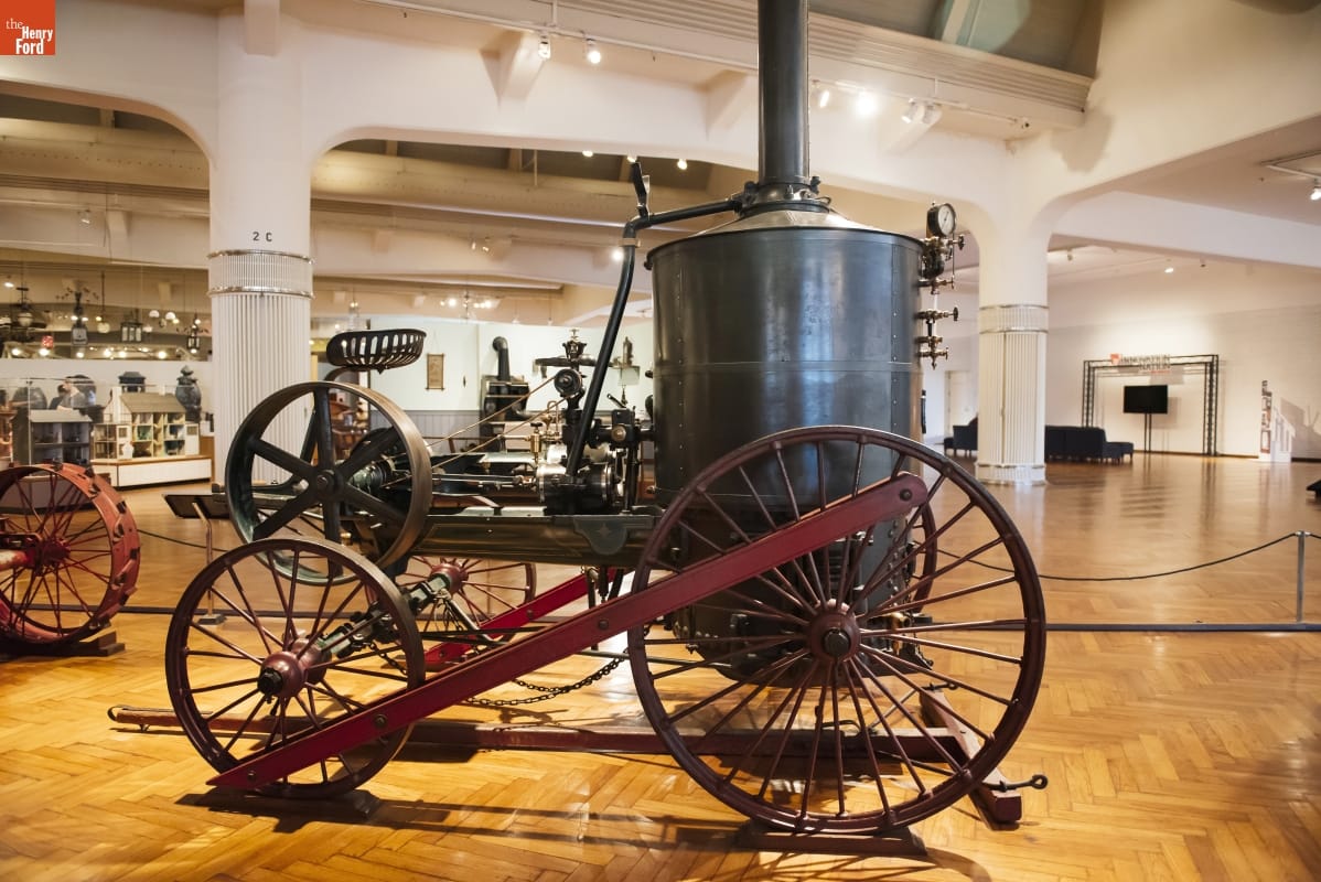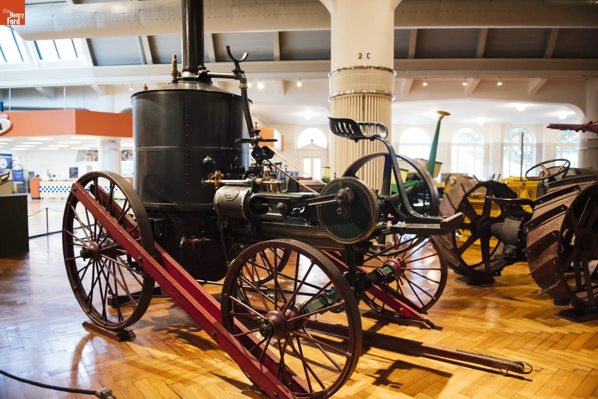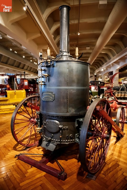Portable steam engines like this powered grain threshers, sawmills, or corn shellers. Horses pulled them from farm to farm. In 1882, 19-year-old Henry Ford was able to make this engine run well when an older man could not; his first accomplishment in the adult world. Thirty years later Ford tracked down the engine, bought it, and returned it to operating condition.