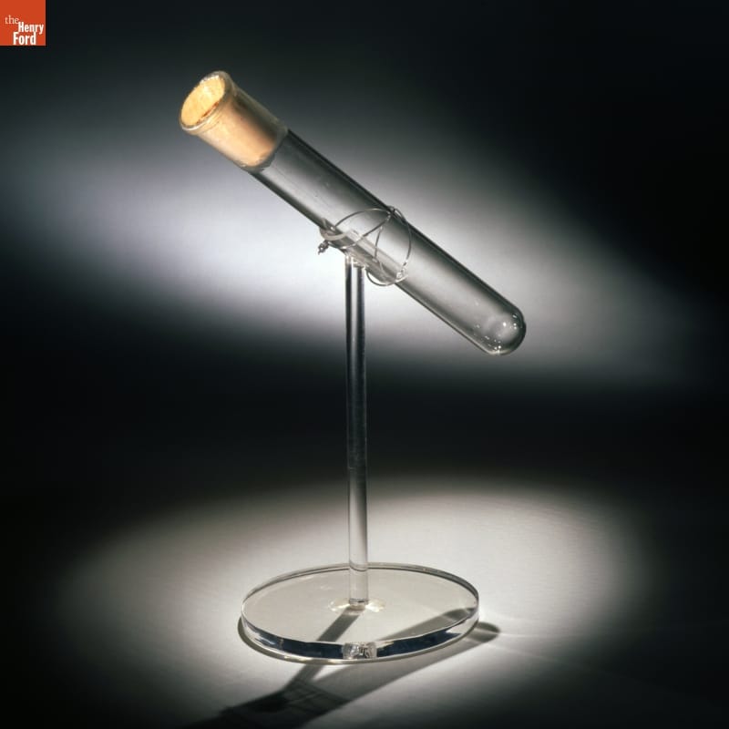 This test tube was one of several that Charles Edison noticed standing open in a rack in the bedroom in which his father had just died in 1931. The attending physician was asked to seal the tubes, one of which Charles later sent on to Henry Ford who kept it with other Edison mementos at his home, Fair Lane.