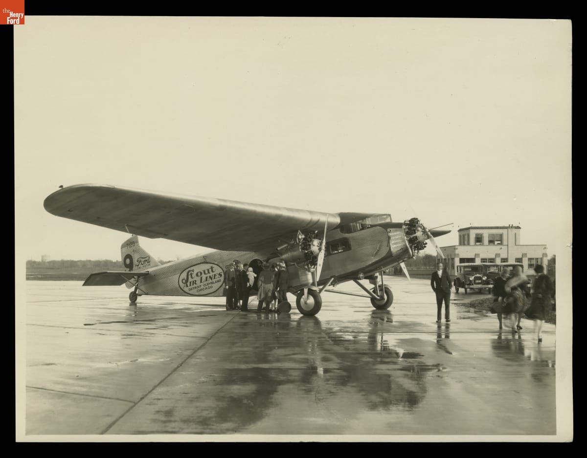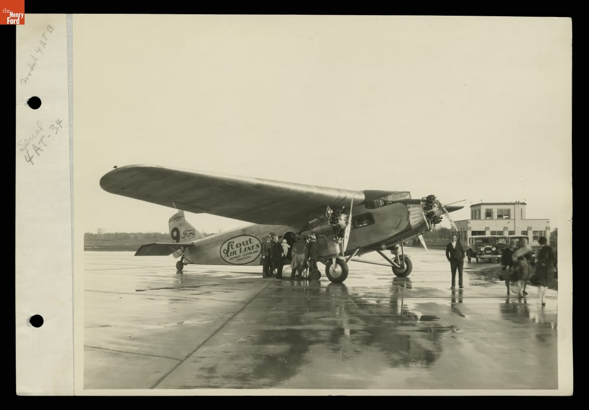 Model 4-AT airliners were designed and built by engineers of the Stout Metal Airplane Company, purchased from William Stout by Ford Motor Company. These rugged planes earned a reputation for being safe and dependable. Many commercial airlines -- including Stout's newly formed Stout Air Lines -- purchased 4-ATs for passenger travel. Here, one of his airliners takes on well-dressed passengers in Dearborn, Michigan.