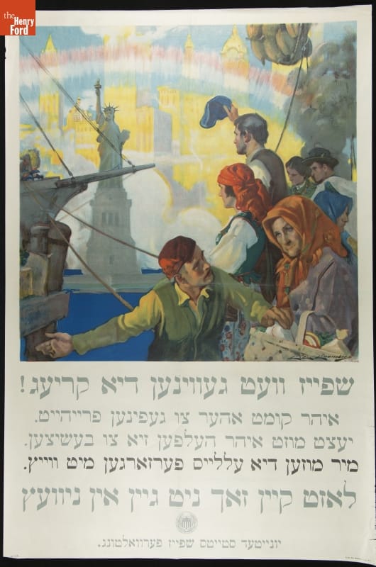 To combat starvation in Europe, President Woodrow Wilson established the U.S. Food Administration in August 1917. This highly successful initiative delivered almost 34 million pounds of food to Europe during and after the war. This Administration's Yiddish-language poster, aimed at Jewish immigrants, begins, "Food will win the war -- You came here seeking freedom, now you must help to preserve it..."