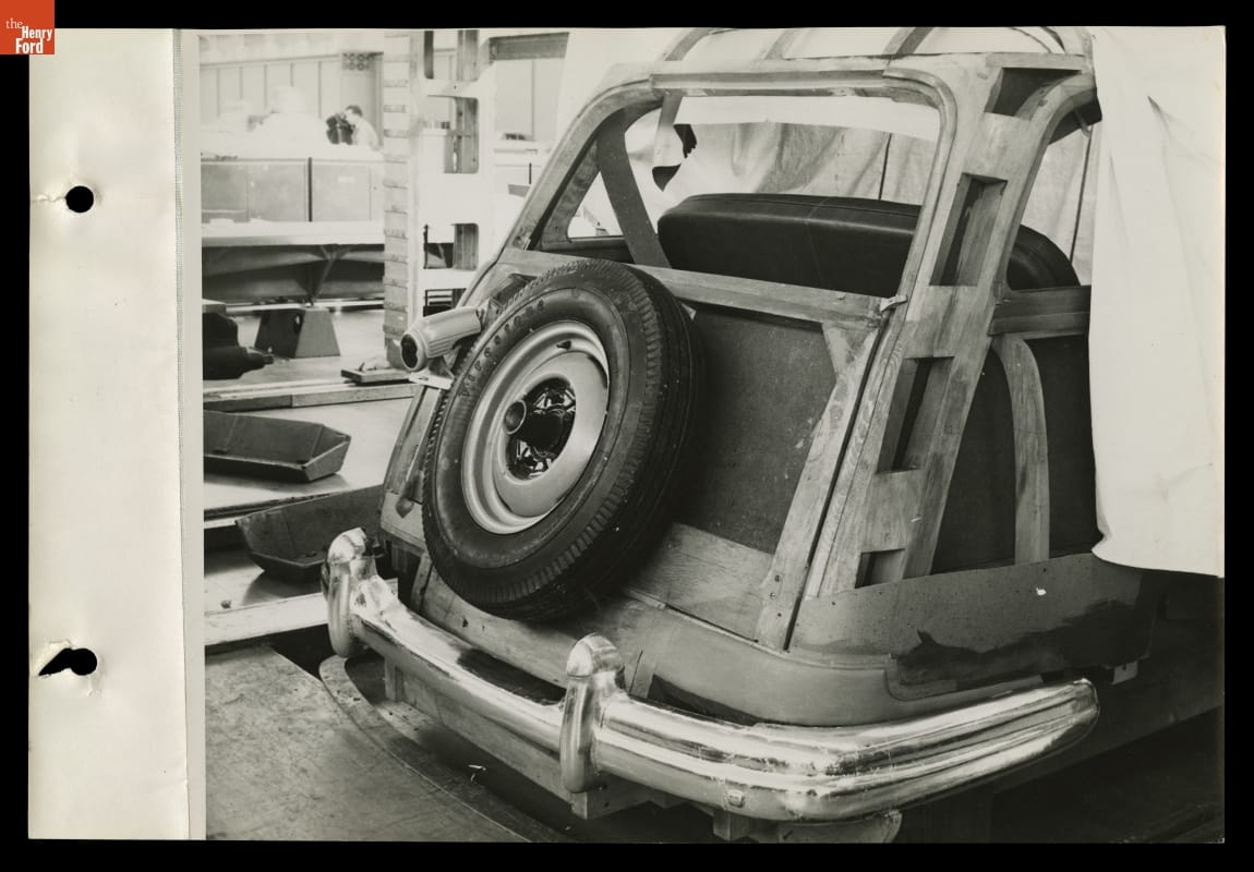 In March 1946, Ford Motor Company sent photographers to its Iron Mountain plant on the Menominee River in Michigan's Upper Peninsula, where workers produced handcrafted station wagon bodies from local hardwood. This photo shows the spare tire carrier and tailgate on what appears to be an early mock-up of the 1949 Ford wagon.