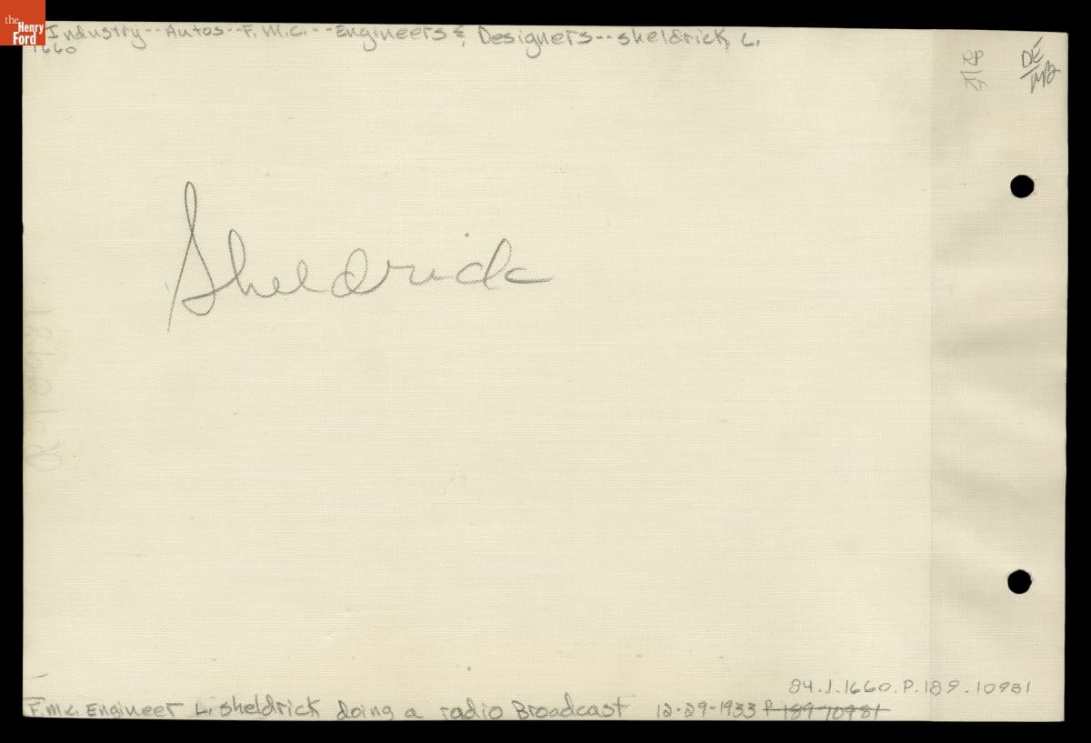 Laurence S. Sheldrick joined Lincoln Motor Company in 1922, shortly after it was purchased by Ford Motor Company. He started as a layout draftsman, working on Lincoln automobiles and Ford's experimental X-8 engine. Later, Sheldrick was involved in engineering for Mercury. During World War II, he designed tank and aircraft engines produced by Ford for the war effort.