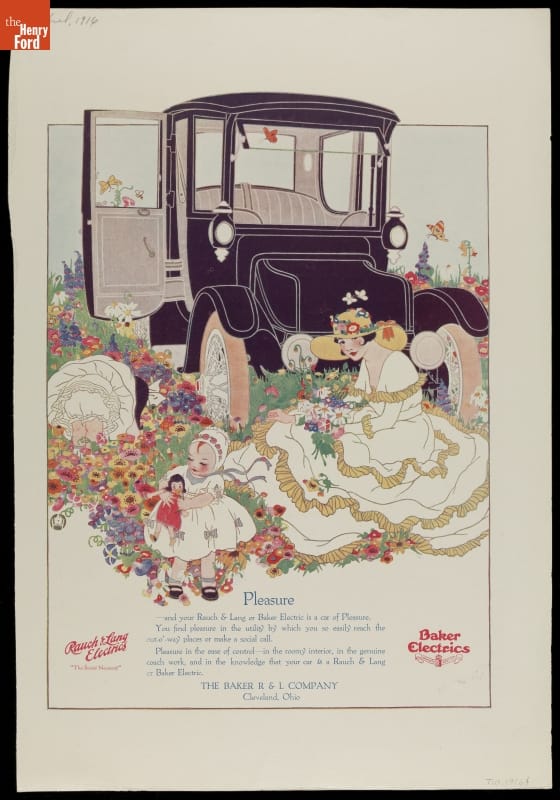 Text reads in part: Pleasure / - and your Rauch & Lang or Baker Electric is a car of Pleasure. / You find pleasure in the utility by which you so easily reach the / out-o'-way places or make a social call. / Pleasure in the ease of control - in the roomy interior, in the genuine / coach work, and in the knowledge that your car is a Rauch & Lang / or Baker Electric.