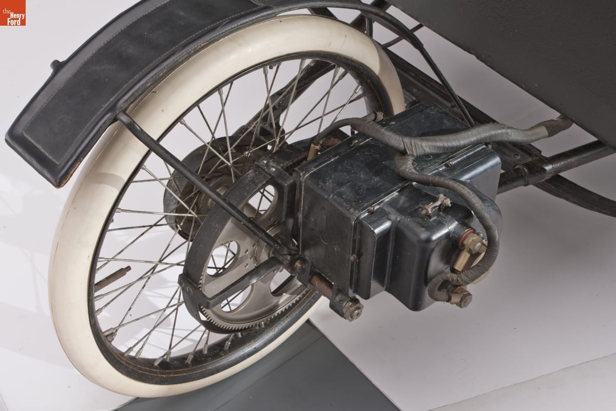 Andrew L. Riker (1868-1930) built this electric tricycle in Brooklyn, NY, in 1896 and used it for two years. With its tubular steel frame, wire wheels and pneumatic tires, Riker’s vehicle owed much to bicycle construction techniques of the time. The tricycle was powered by a series of sulfuric acid-lead batteries installed under the seat, and propelled by a 40-volt electric motor mounted at the rear. The motor turned a single rear wheel, which eliminated the need for a differential. Andrew Riker founded the Riker Electric Vehicle Company in 1897 in Brooklyn, New York, and manufactured electric automobiles and trucks. But he sold his firm just three years later. Despite his experience with the electric tricycle and other battery-powered vehicles, Riker concluded that the future belonged to gasoline. In 1902, he joined Locomobile Company of America and began designing gasoline-powered automobiles.