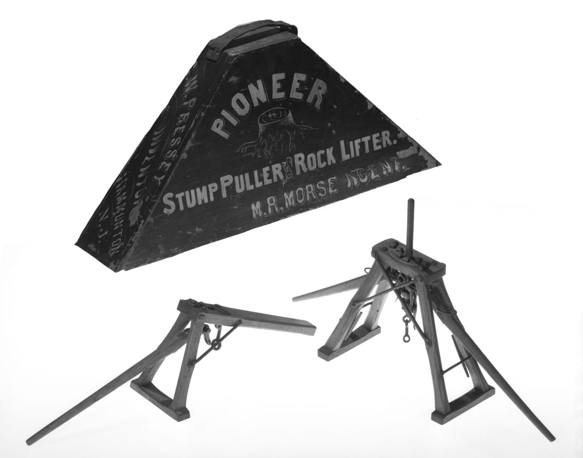 Preparing newly cleared land for cultivation sometimes involved the difficult task of pulling stumps and removing rocks. Salesmen used scale models such as this "Pioneer" kit to persuade customers to invest in devices to leverage obstacles out of fields.