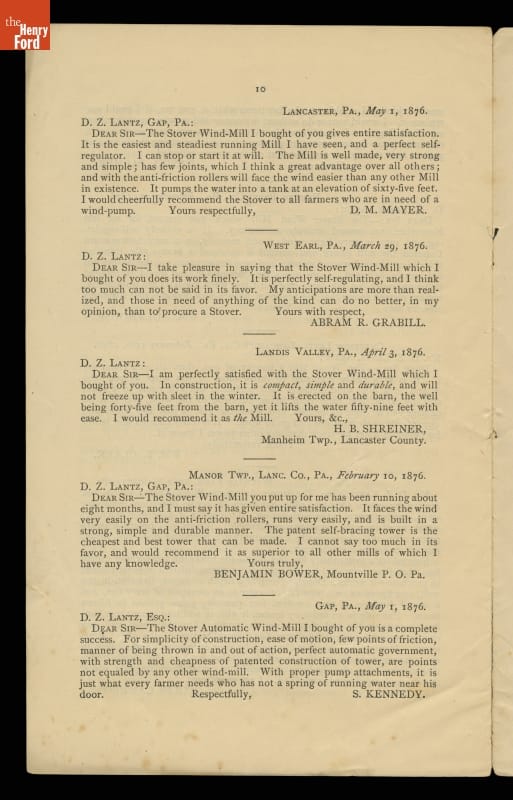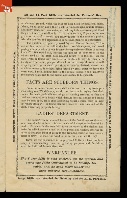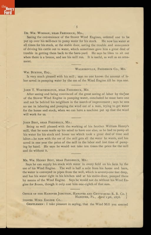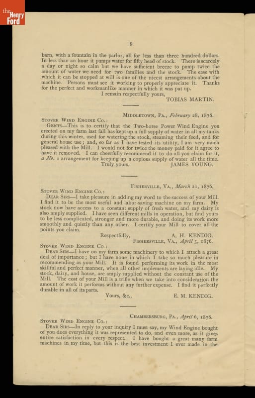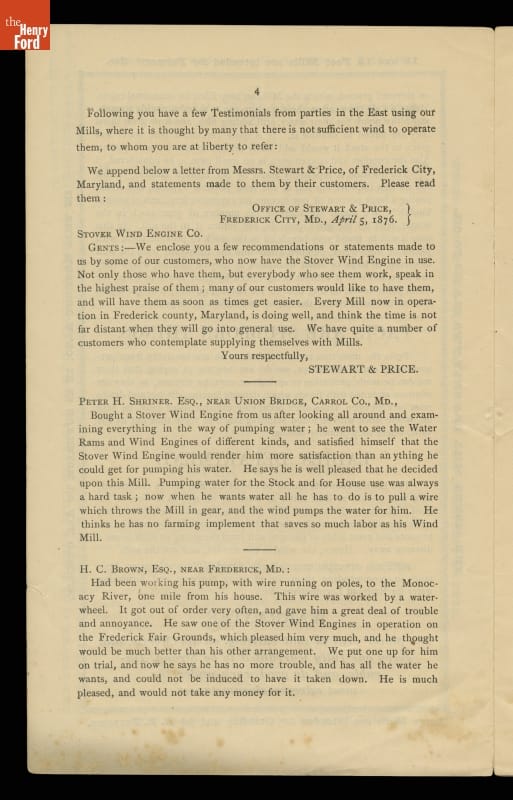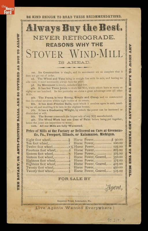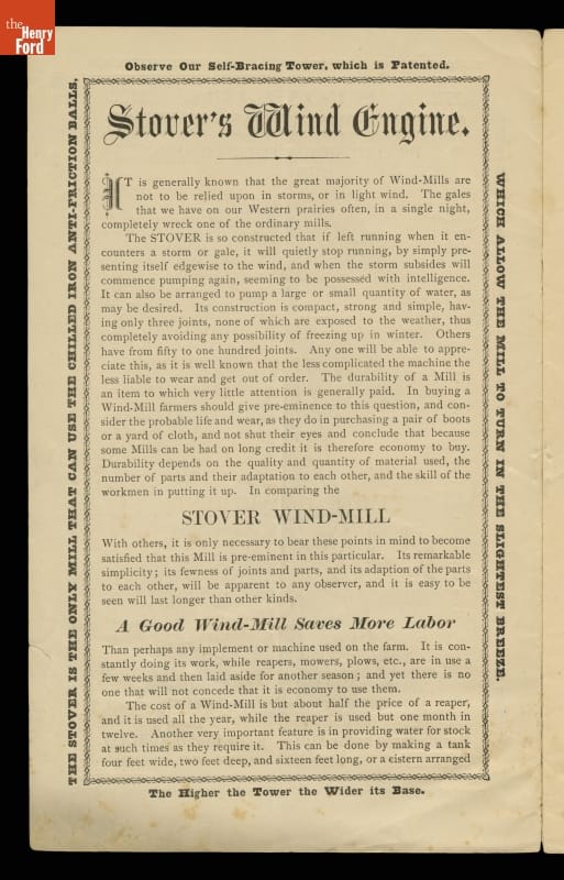 Many American farmers in the late 1800s bought windmills to pump water and power machinery. The Stover Wind Engine Company -- one of several companies that used the Stover name -- manufactured windmills for a brief period around the late 1870s. With pages of testimonials, this Stover catalog touted the durable construction and labor- and money-saving qualities of its windmills.
