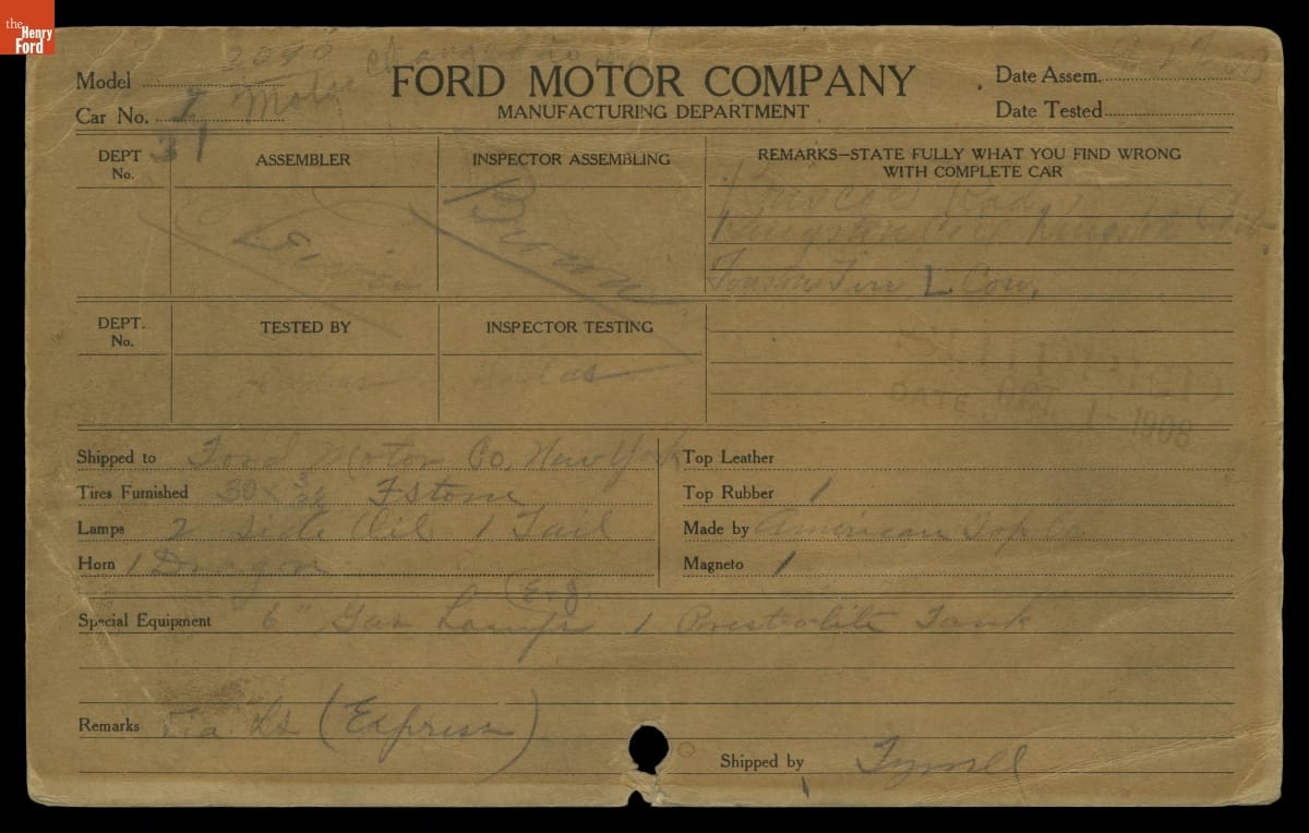 First Ford Model T Production Card, September 27, 1908
