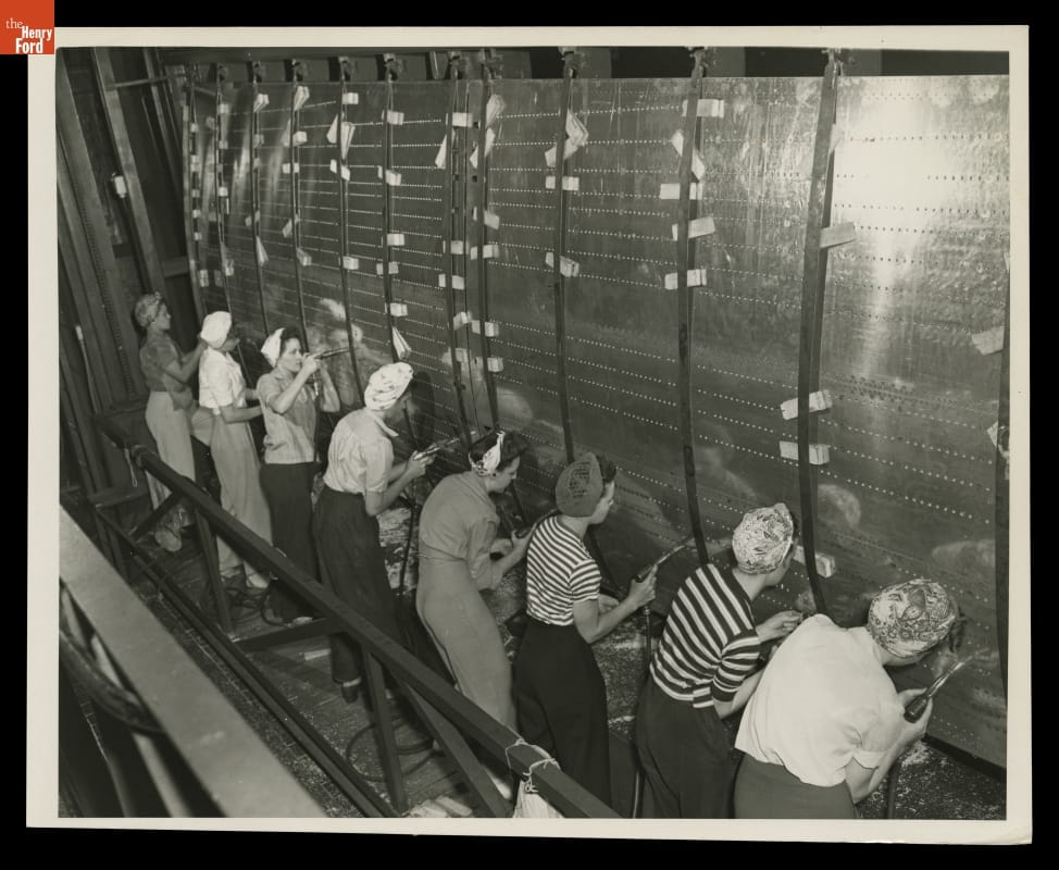 Women represented approximately one-third of the workers at Ford Motor Company's Willow Run plant, where they did everything from clerical work in the offices to riveting and welding on the assembly line. During World War II, women joined the workforce in record numbers to take on essential jobs traditionally held by men who had joined the armed forces.