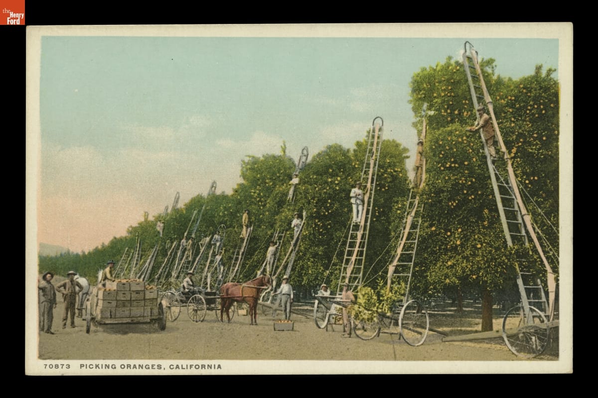 Text at bottom of front of postcard: 70873 PICKING ORANGES, CALIFORNIA
