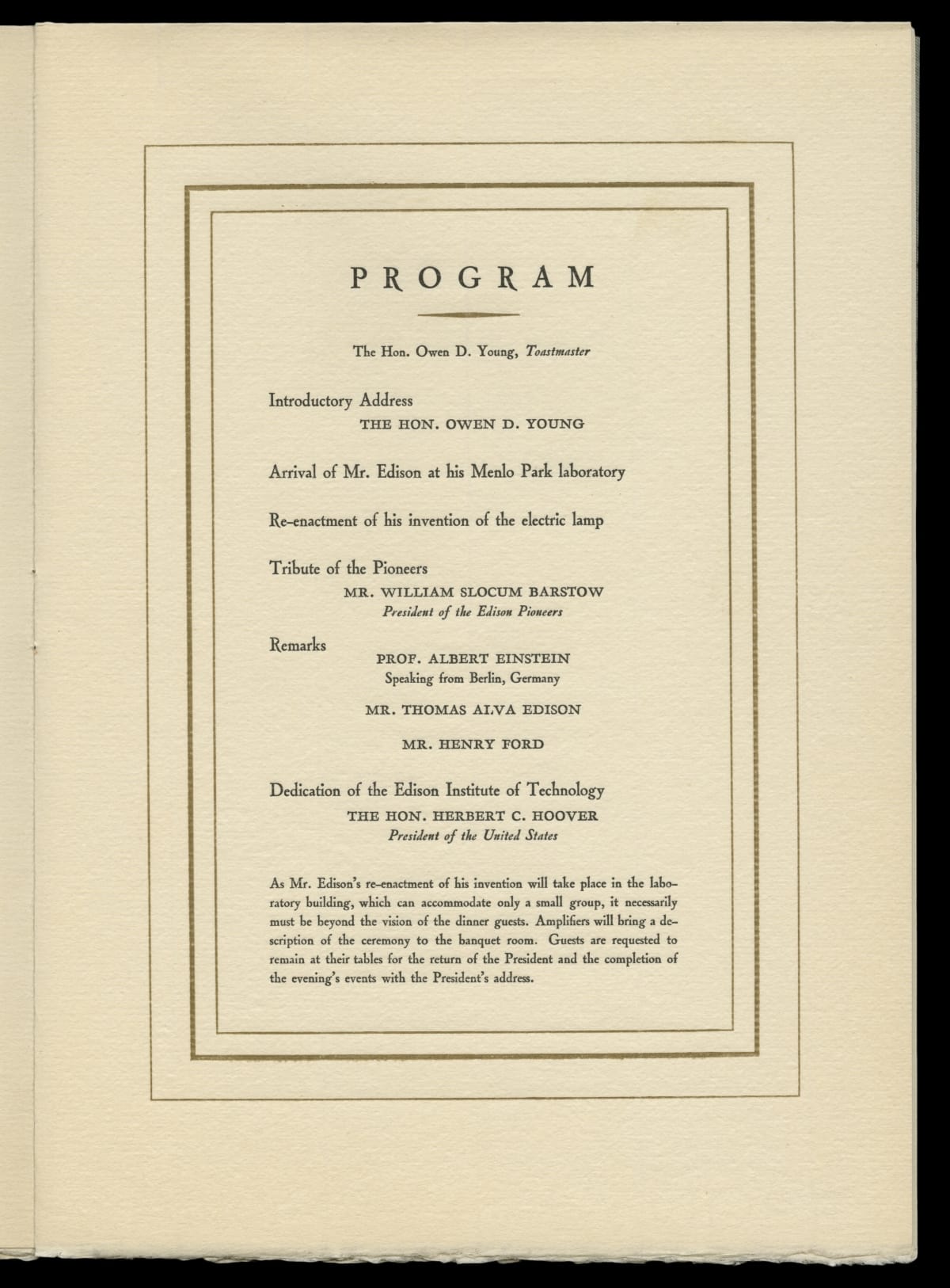 Program for Dinner in Honor of Thomas Alva Edison during Light's Golden Jubilee, October 21, 1929