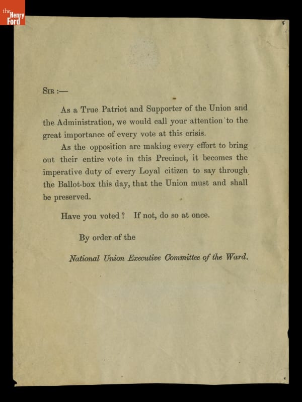 National Union Party Election Day Handbill, November 8, 1864
