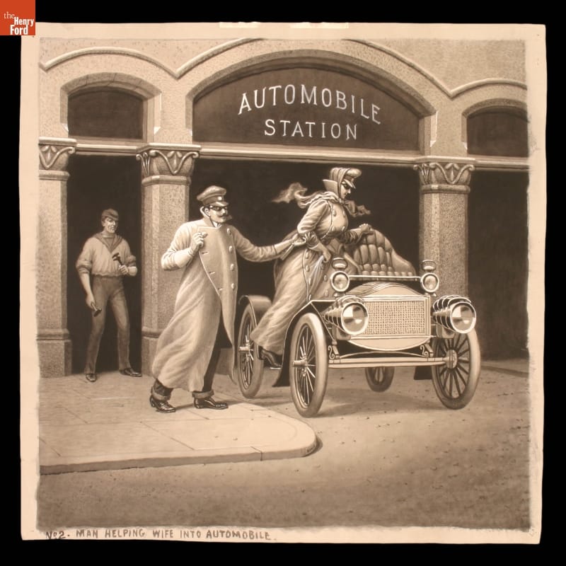 "Man Helping His Wife into Automobile," Drawing for the Magic Lantern Slide Series "Mr. Spurt and His Auto," 1906