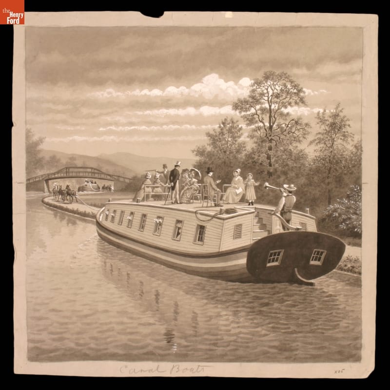 Joseph Boggs Beale created artwork that was reproduced to make magic lantern slides. His works include some of the most artistic slide illustrations made in the late 19th and early 20th centuries. Beale was also prolific, producing more than 2,000 images used in over 250 different lantern slide sets. This drawing, from a history of transportation set, depicts a trip on a canal boat.