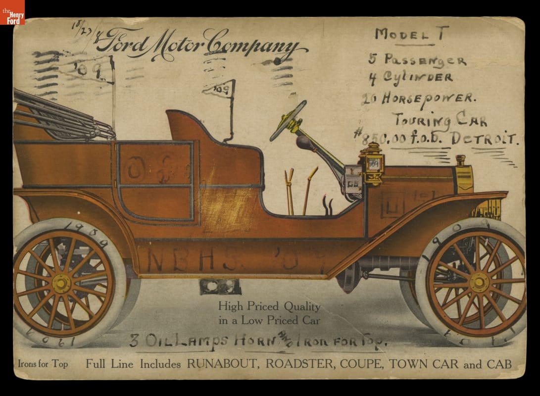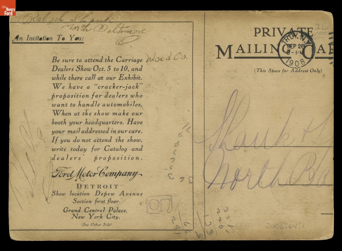 Printed on front: Ford Motor Company High Priced Quality in a Low Priced Car Irons for Top. Full Line Includes RUNABOUT, ROADSTER, COUPE, TOWN CAR, AND CAB Printed on back: An Invitation to You: Be sure to attend the Carriage Dealers Show Oct. 5 to 10, and while there call at our Exhibit. We have a "cracker-jack" proposition for dealers who want to handle automobiles. When at the show make our booth your headquarters. Have your mail addressed in our care. If you do not attend the show, write today for Catalog and Dealers proposition. Ford Motor Company DETROIT Show location Depew Avenue Section first floor. Grand Central Palace, New York City... Written on back: Ralph Shank New Baltimore [New York?] Postmarked Troy, NY September 28, 1908. Written on front in ink: Model T 5 Passenger 4 cylinder 20 Horsepower Touring Car $850.00 f.o.b. Detroit. 3 Oil Lamps Horn and Iron For Top. Also written on front, on the side of the car is: N.B.H.S. '09 . Two flags are drawn in as if mounted on the car, and they read "'09". The year "1909" is written in on the car's white tires.