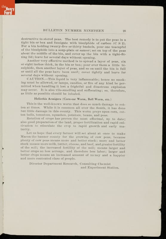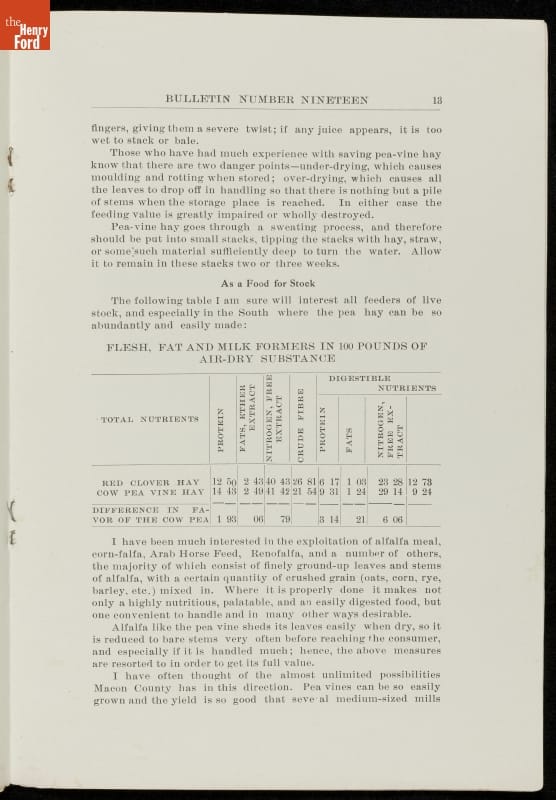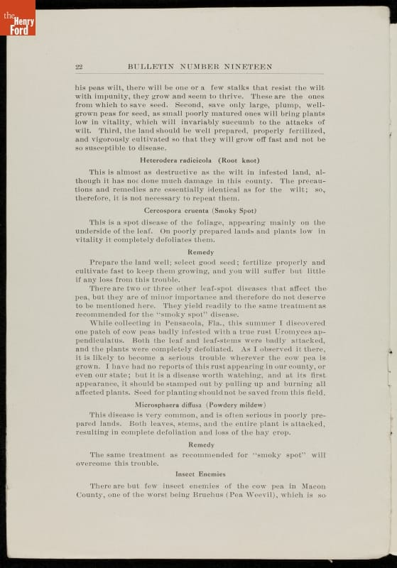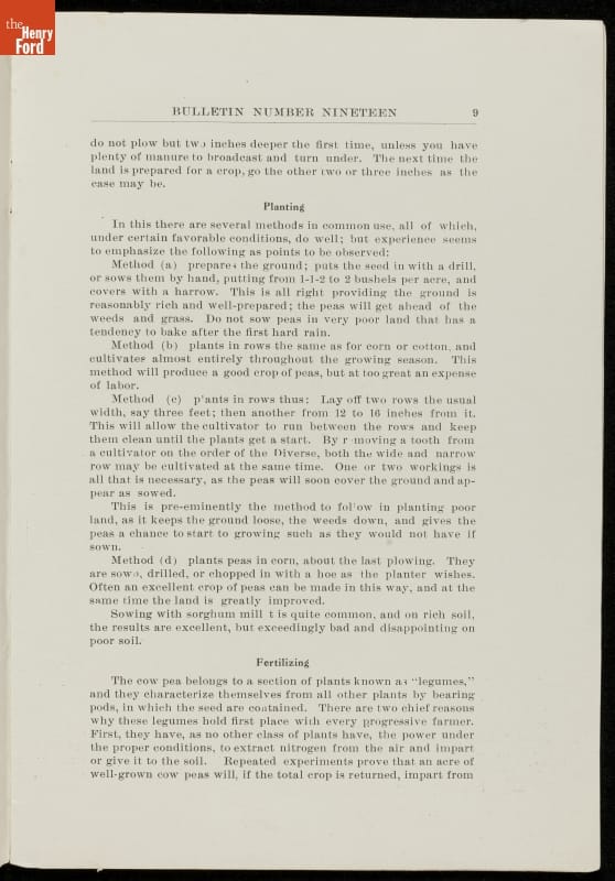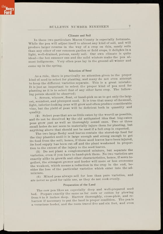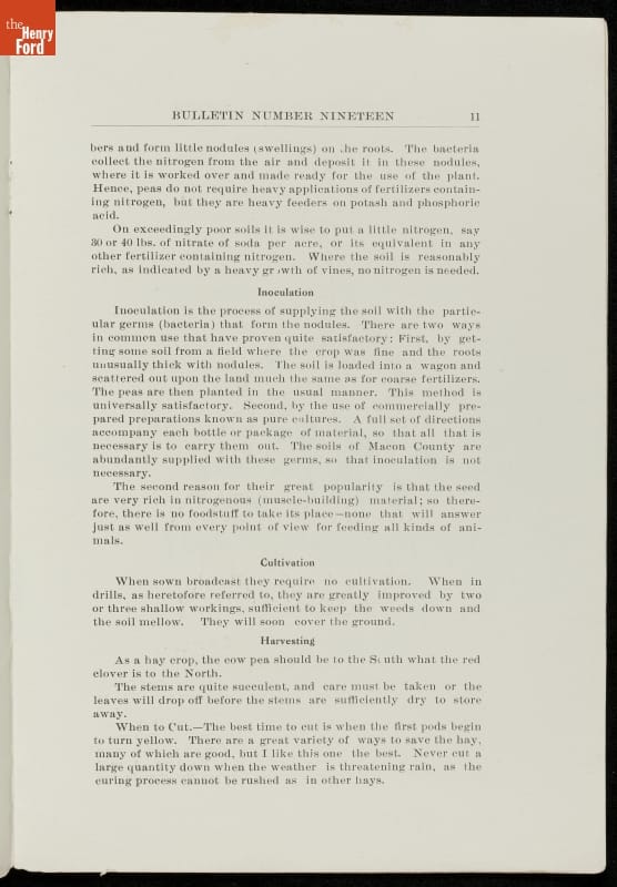 Among George Washington Carver's scientific contributions were the bulletins he issued from the Experiment Station of the Alabama state extension service that he established at the Tuskegee Institute. Carver wrote what he called "threefold" agricultural bulletins, with information for farmers, teachers, and housewives. This bulletin taught readers that cow peas were good for depleted soils as well as good to eat.