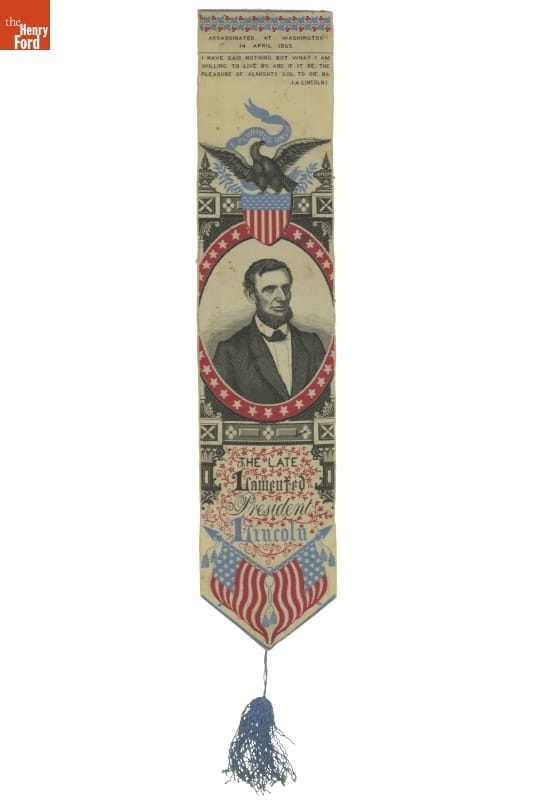 In 1865, Thomas Stevens created this woven silk bookmark to memorialize the recently assassinated American president. Admirers of President Lincoln collected materials such as this as a way to remember their martyred hero. A quote from Lincoln appears at the top, "I have said nothing but what I am willing to live by and, if it be the pleasure of Almighty God, to die by."