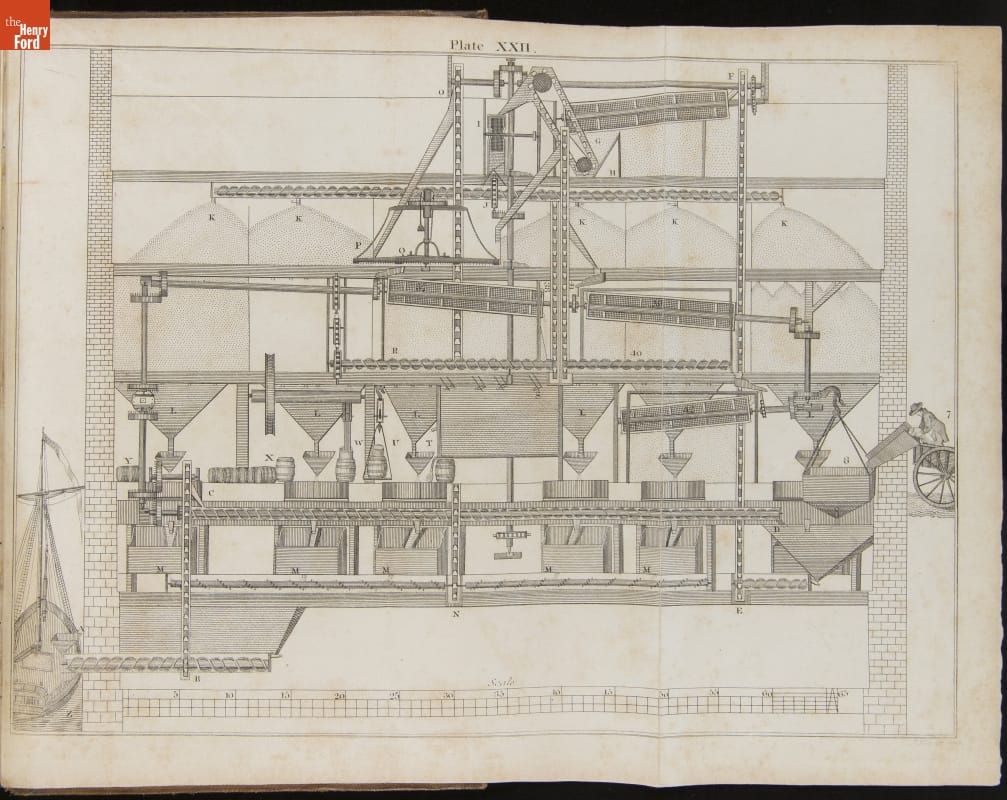 This instructional handbook was originally written and published by Oliver Evans (1755-1819). In the late 1700s, Evans developed a continuous conveyor system for milling flour. The Young Mill-Wright and Miller's Guide explained his labor-saving innovations through text and technical illustrations. Published in fifteen editions between 1795 and 1860, the influential book helped revolutionize the flour-milling industry.