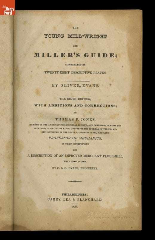 On spine: MILL-WRIGHT'S / GUIDE On title page: THE / YOUNG MILL-WRIGHT / AND / MILLER'S GUIDE; / ILLUSTRATED BY / TWENTY-EIGHT DESCRIPTIVE PLATES. / BY OLIVER EVANS, / THE NINTH EDITION, / WITH ADDITIONS AND CORRECTIONS, / BY / THOMAS E. JONES, / ...