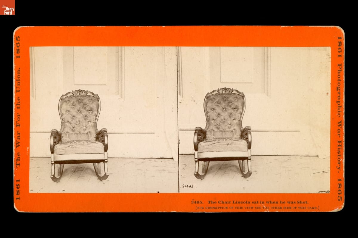 Printed on front of either side of stereograph image: on left side: 1861 The War for the Union. 1865 Printed on front right side: 1861 Photographic War History. 1865 Handwritten into image on lower right side: 3405 Printed on front, lower right under the image: 3405. The Chair Lincoln sat in when he was Shot. (For Description of this view see the other side of this card) Printed on back of images: 3405. The Chair Lincoln sat in when he was Shot. This easy chair was placed in the private box in Ford's Theater, Washington, specially for the use of President Lincoln, who, after the wearisome toil of the day liked to rest himself and for the time forget the cares of State by watching the play at the theater. It was while sitting in this chair on the evening of April 14, 1865, that the cowardly assassin sneaked into the private box and creeping up behind the noble Lincoln, fired the fatal shot. Printed in middle section: 1861-- PHOTOGRAPHIC HISTORY-- 1865 This series of pictures are ORIGINAL PHOTOGRAPHS taken during the war of the Rebellion. More than a quarter of a century has passed away since the sun painted these real scenes of that great war, and the "negatives" (made by the old "wet plate" process) have undergone chemical changes which renders it slow and difficult work to get "prints" from them. Of course no more "negatives" can be made, as the scenes represented by this series of war views have passed away forever. The great value of these pictures is apparent. Some "negatives" are entirely past printing from, and all of them are very slow printers. Also printed on back: A Word as to Prices: A gentleman... [a very long anecdote which does not refer to this image of the Lincoln chair]...If you wish for a catalogue of the war views, send a stamp and your address to Yours in F.C and L., TAYLOR AND HUNTINGTON, Sole Owners of the Original War Views. No.2 State St. HARTFORD, CONN.