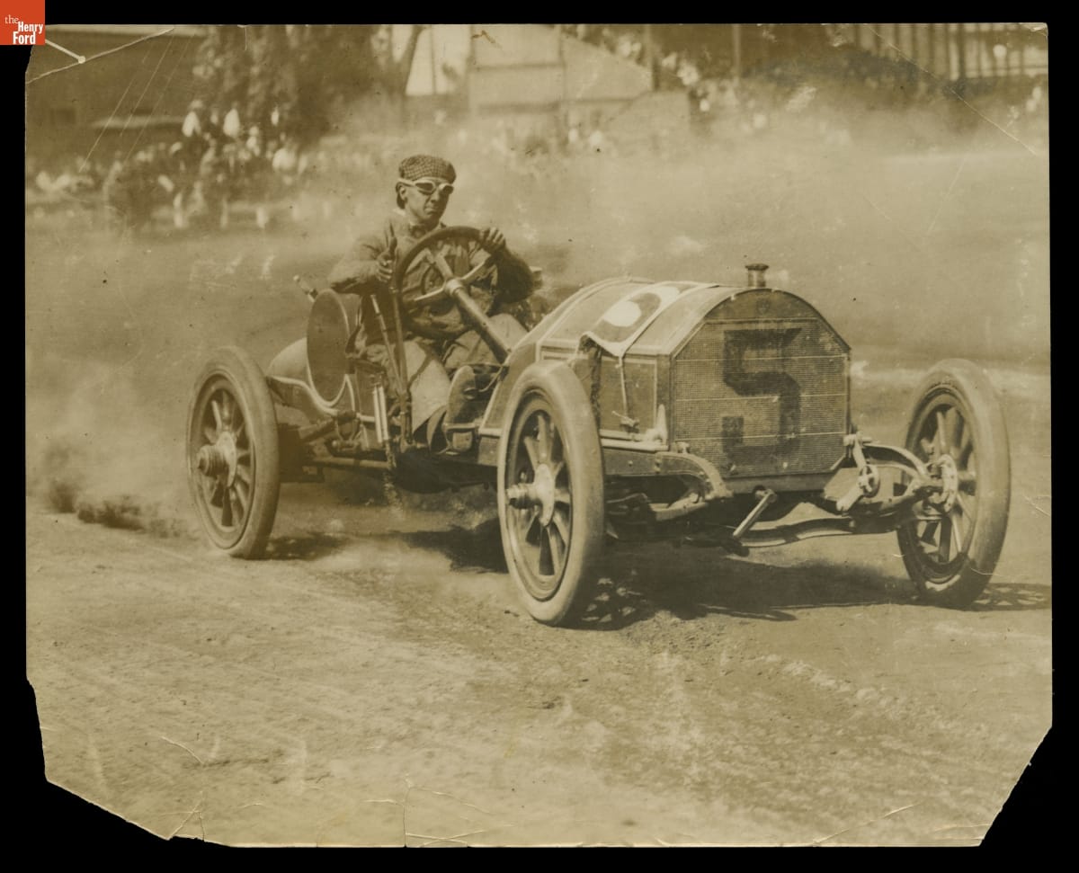 Louis Nikrent kicks up dust in his #5 Mercer during the Santa Monica Road Race in the 1913 Grand Prix season. He finished third behind fellow Americans Earl Cooper and Barney Oldfield. Santa Monica was the season's only race won by an American driver.