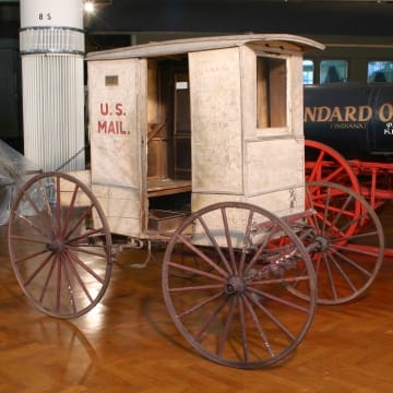 Officially adopted in 1896, Rural Free Delivery was a boon to residents who were previously required to collect their mail in the nearest town. Rural routes were long and served hundreds of customers, so carriers often purchased horse-drawn wagons to facilitate their perennial labor. Here, August Edinger of Kimmswick, Missouri, poses with the wagon he used from 1902 to 1925.