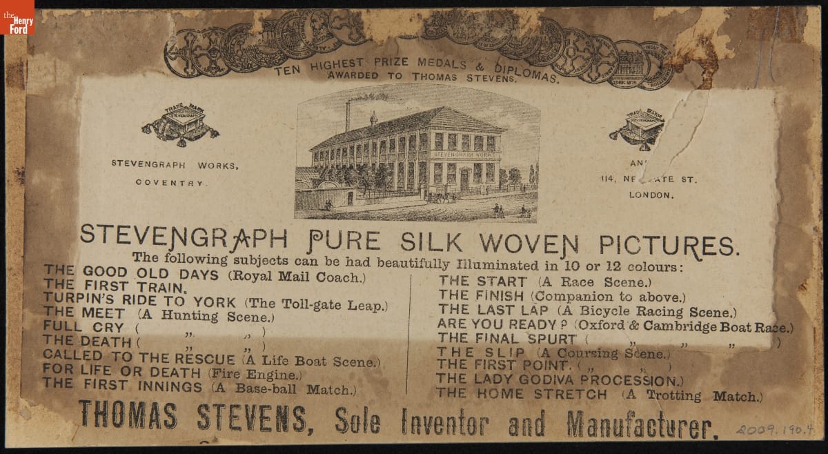 on front matte, under image: WOVEN IN SILK BY THOMAS STEVENS, INVENTOR AND MANUFACTURER, COVENTRY AND LONDON. (REGISTERED) / The First Innings. on back, title: The First Innings/ Date: 1880 (dated by Newgate St. address,/ 18 titles available and 10 medal awards/ on back label) on back, advertisement: .../ STEVENGRAPH PURE SILK WOVEN PICTURES / The following subjects can be had beautifully illuminated in 10 or 12 colors: / THE GOOD OLD DAYS (Royal Mail coach) / THE FIRST TRAIN. / TURPIN'S RIDE TO NEW YORK (The Toll-Gate Leap) / THE MEET (A hunting Scene)... / THE FIRST INNINGS (A Base-ball Match.) / ... / THOMAS STEVENS, Sole Inventor and Manufacturer.