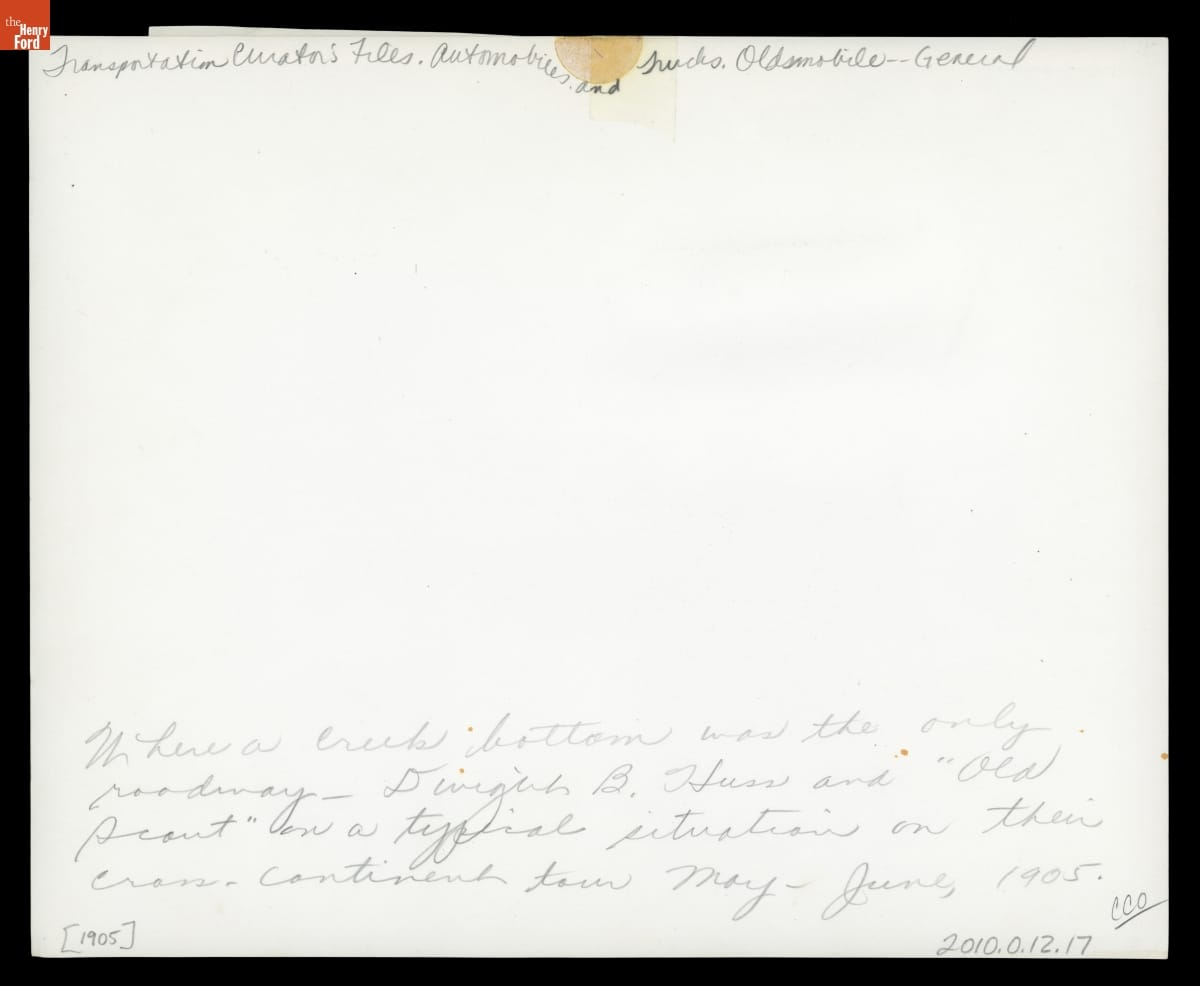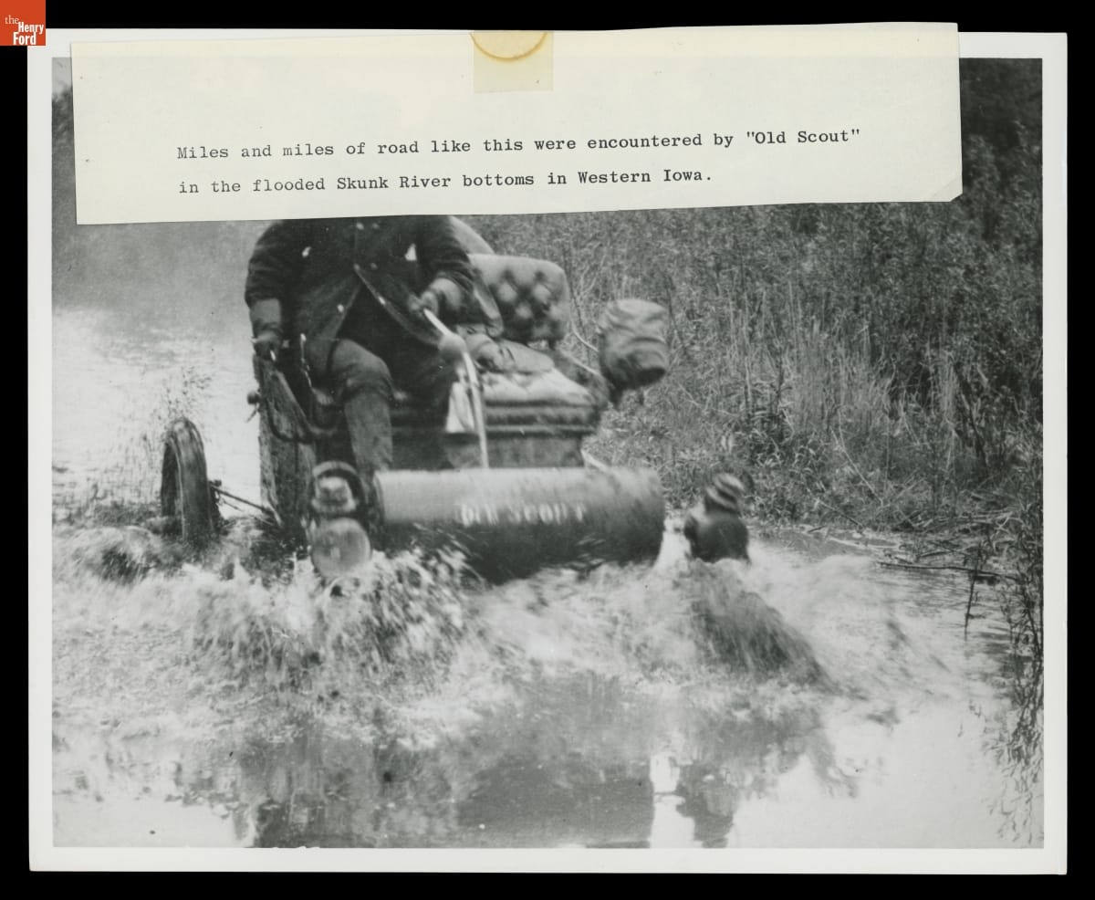 In 1905, two Oldsmobiles competed in an east to west transcontinental race from New York City to Portland, Oregon. In this photograph Dwight B. Huss navigates "Old Scout" through Iowa's flooded Skunk River. Old Scout won the race over his competitor "Old Steady" reaching Portland in forty-four days.