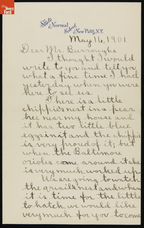 In May 1901, John Burroughs traveled to the State Normal School in New Paltz, New York, to share his love of nature with the students. On a hike he discussed the local landscape and made observations about the natural world -- the group even found a quail's nest with eggs. Students later wrote thank you notes and invited Burroughs back for a future visit.